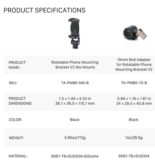 Tilta TA-PMB5-15K-B vrtljivi nosilec za telefon V2 z 15-mm nosilcem za palico je profesionalna sponka za pametne telefone (primerna za telefone širine 3–3,8 palca) z možnostjo vrtenja za 360° in silikonsko oblazinjenimi čeljustmi, ki je združena z enim 15-mm adapterjem za palico z zaskočnimi zatiči proti vrtenju – idealna za namestitev telefona…
