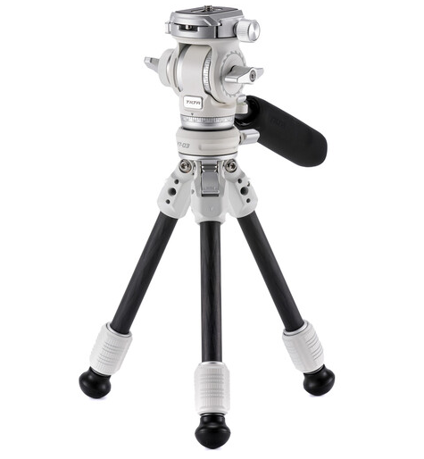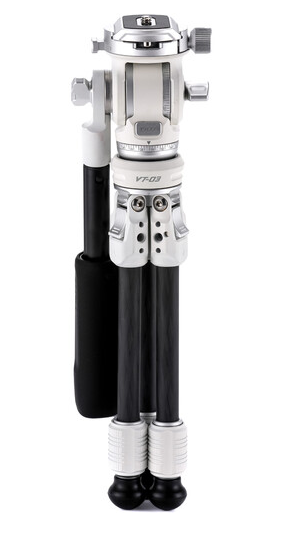 VT03 je zasnovan za vsestransko uporabo, delovni višinski razpon je od 6 do 13,7 palca, zloži se na samo 11,1 palca, kar ga naredi idealnega za potovanja in kompaktna snemalna okolja. Dvodelne noge uporabljajo mehanizem za zaklepanje z vrtenjem in podpirajo tri nastavljive kote nog (22°, 55° in 82°), kar omogoča stabilno namestitev na neravnih površinah. Tekoča glava podpira gladko 360° vrtenje in nagibanje od +90° do -60° ter vključuje ploščo za hitro sprostitev tipa Arca za hitro namestitev kamere.