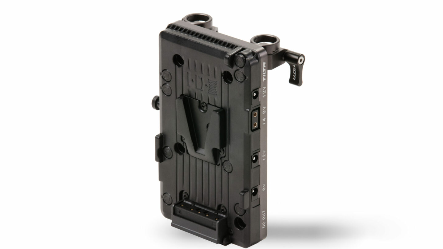Ta baterijska plošča V-mount omogoča napajanje združljivega fotoaparata in zunanje dodatne opreme z baterijami V-mount in vgrajenimi napajalnimi priključki P-tap/DC na plošči.