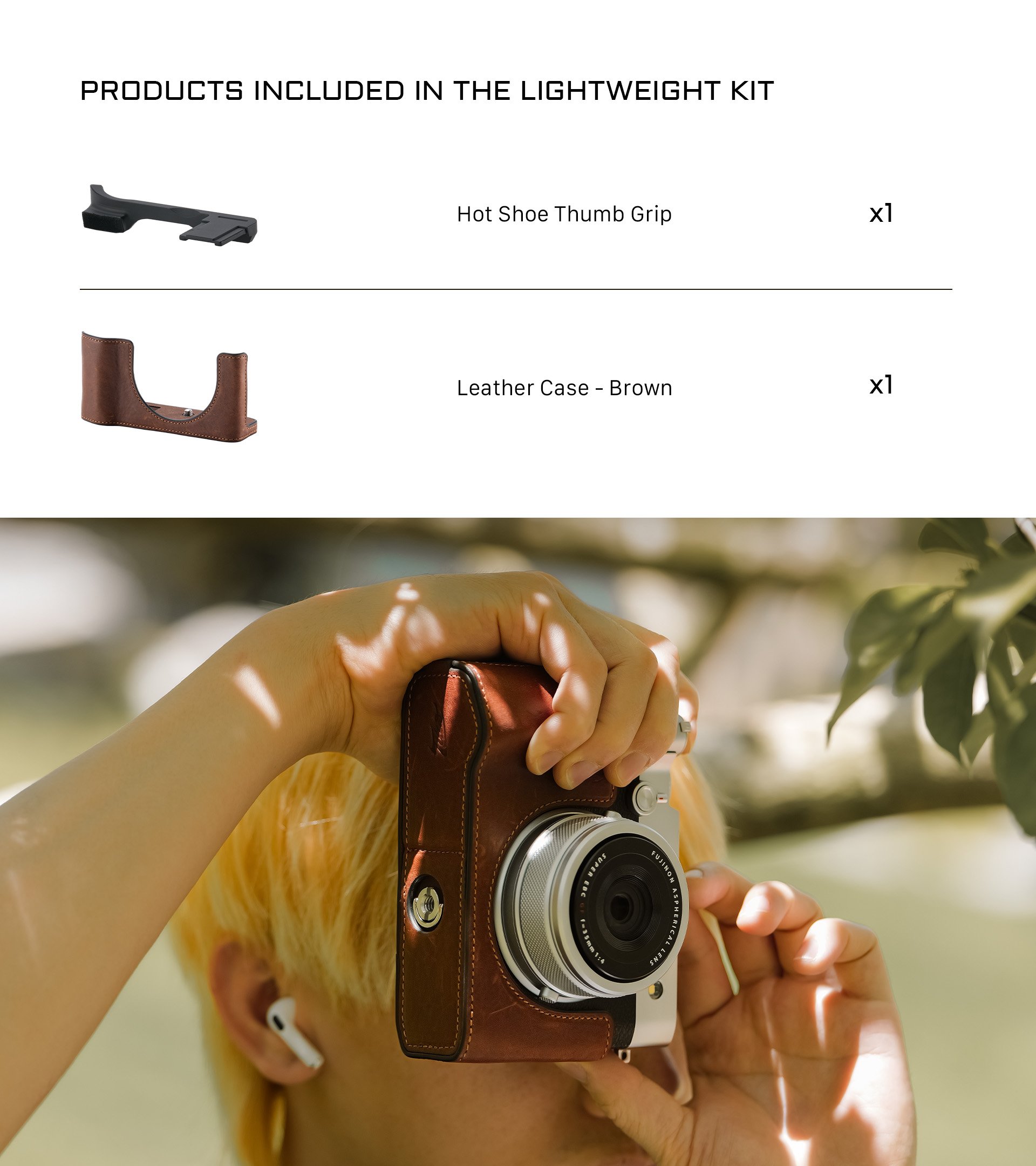 Ta komplet vključuje usnjeno torbico za fotoaparat Fujifilm GFX100RF, ki se pritrdi z vijakom 1/4″-20 in uporabnikom omogoča udobnejše upravljanje in rokovanje s fotoaparatom prek integriranega ročaja.