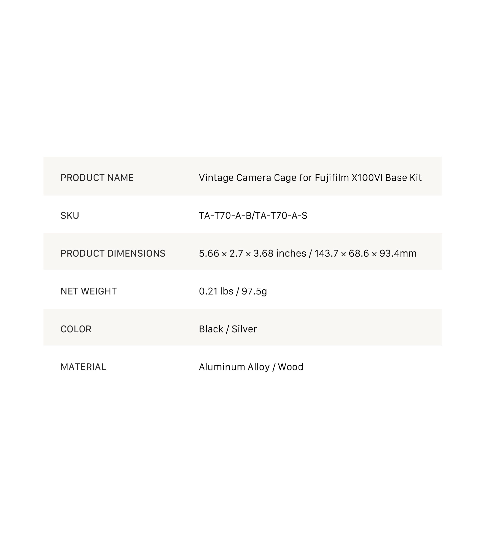 Predstavljamo kletko za fotoaparat Vintage za osnovni komplet Fujifilm X100VI. Ta komplet vključuje nekaj izbranih dodatkov, ki izboljšajo funkcionalnost fotoaparata X100VI, hkrati pa ohranjajo sistem vitek in prenosen. Osnova tega kompleta je nosilec v obliki črke L z lesenim ročajem, izdelanim iz orehovega lesa, ki omogoča udobnejše upravljanje in rokovanje s fotoaparatom.