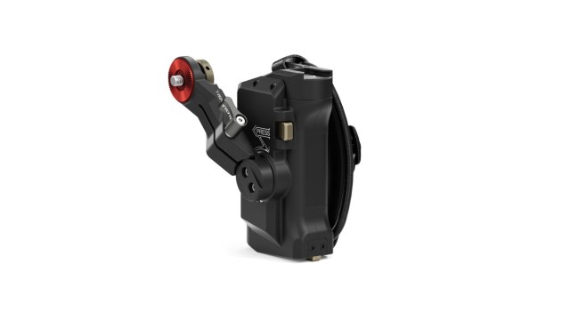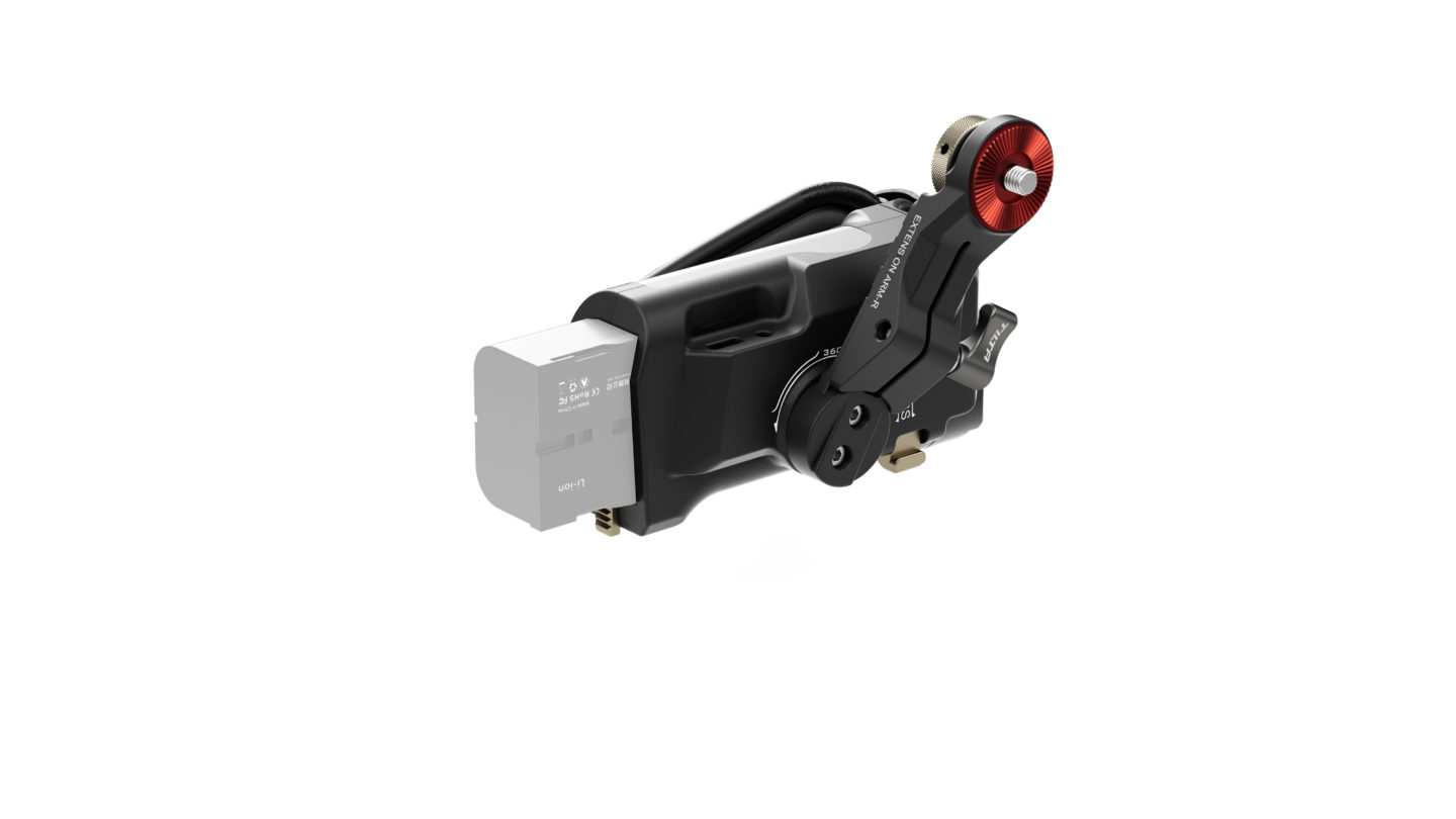 To napredno držalo se pritrdi na levo stran kletk za kamere Tiltaing. Vhod za baterijo na dnu ročaja omogoča uporabo baterije Sony F570 za napajanje različnih dodatkov prek 8-voltnega USB-C in 12-voltnega enosmernega izhoda.