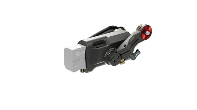 To napredno držalo se pritrdi na levo stran kletk za kamere Tiltaing. Vhod za baterijo na dnu ročaja omogoča uporabo baterije Sony F570 za napajanje različnih dodatkov prek 8-voltnega USB-C in 12-voltnega enosmernega izhoda.