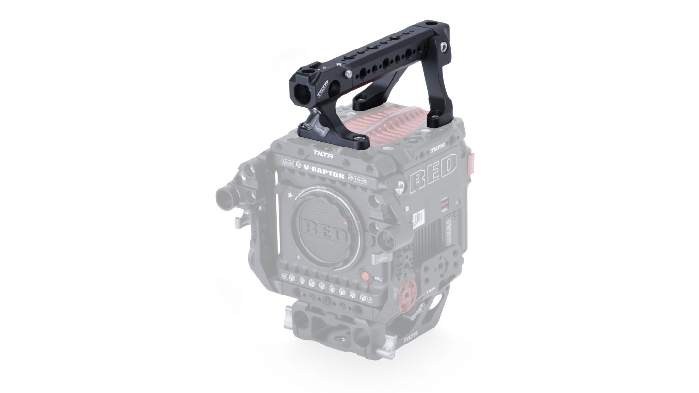 Ta zgornji ročaj se pritrdi na zgornjo in sprednjo zgornjo ploščo fotoaparata RED V-RAPTOR, kar zagotavlja varno stično točko za rokovanje in upravljanje fotoaparata ter dodatne točke za pritrditev dodatne opreme.