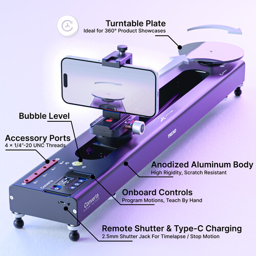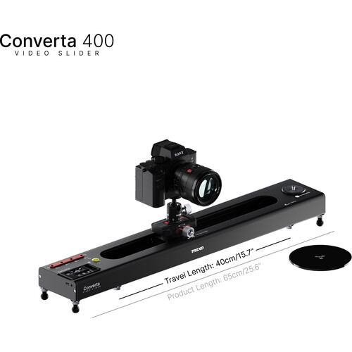 Ne glede na to, ali snemate počasne kinematografske premike ali dinamične hitre pomike s hitrostjo do 1,18 palca na sekundo, vam Converta C400 omogoča popoln ustvarjalni nadzor. Drsnik upravljajte prek vgrajenega menija, mobilne aplikacije ali celo glasovnih ukazov. Integracija z uro Apple Watch prinaša še več prilagodljivosti pri snemanju.