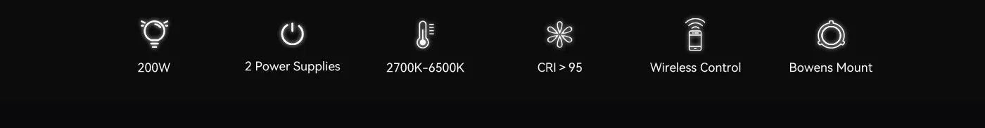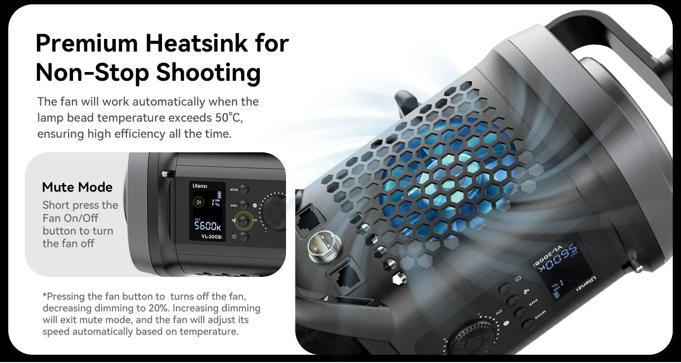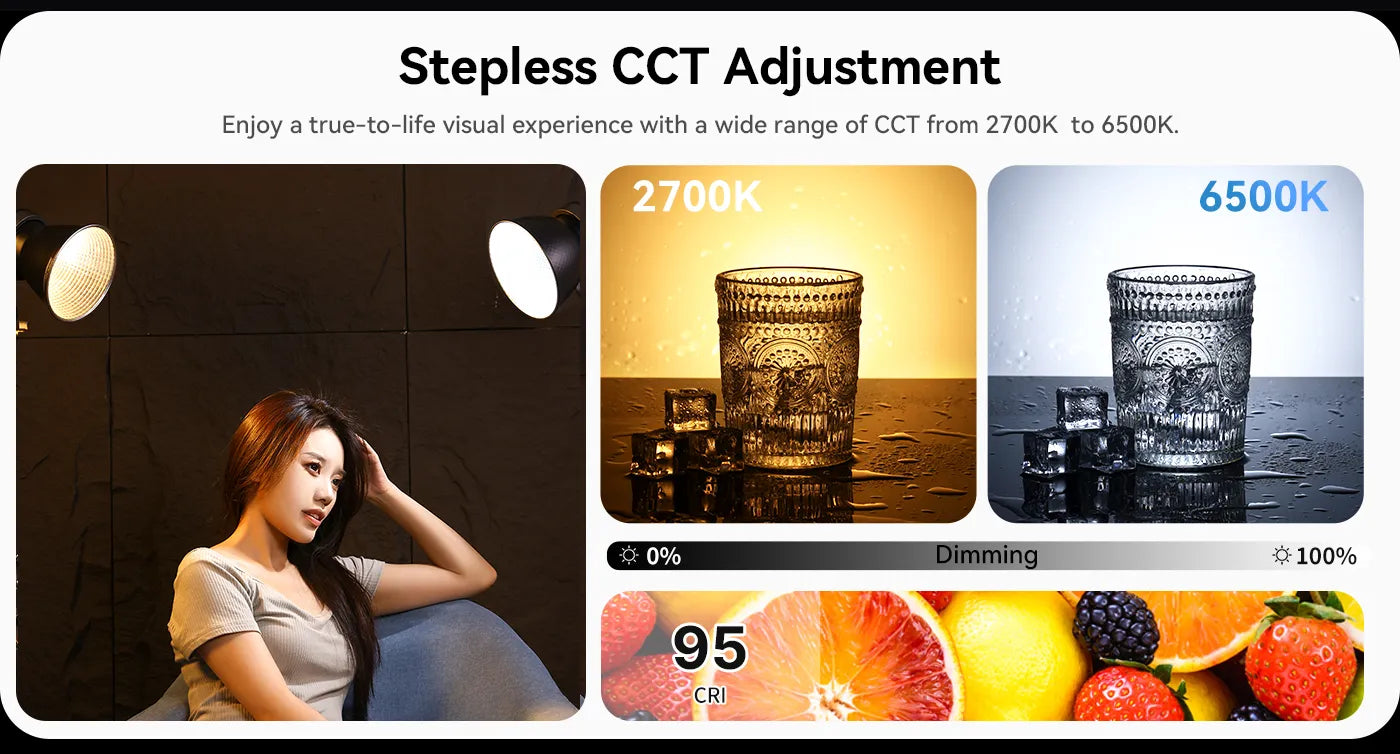 Z dvojno možnostjo napajanja lahko uporabite baterijo V-mount za mobilnost na prostem ali napajalnik DC za stabilno uporabo v notranjih prostorih. Barvno temperaturo lahko brezstopenjsko nastavljate od 2700 K do 6500 K (CRI>95) in jo zatemnite od 0 % do 100 %. Vrhunski hladilnik zagotavlja neprekinjeno snemanje, z avtomatskim ventilatorjem in načinom utišanja za tiho delovanje.