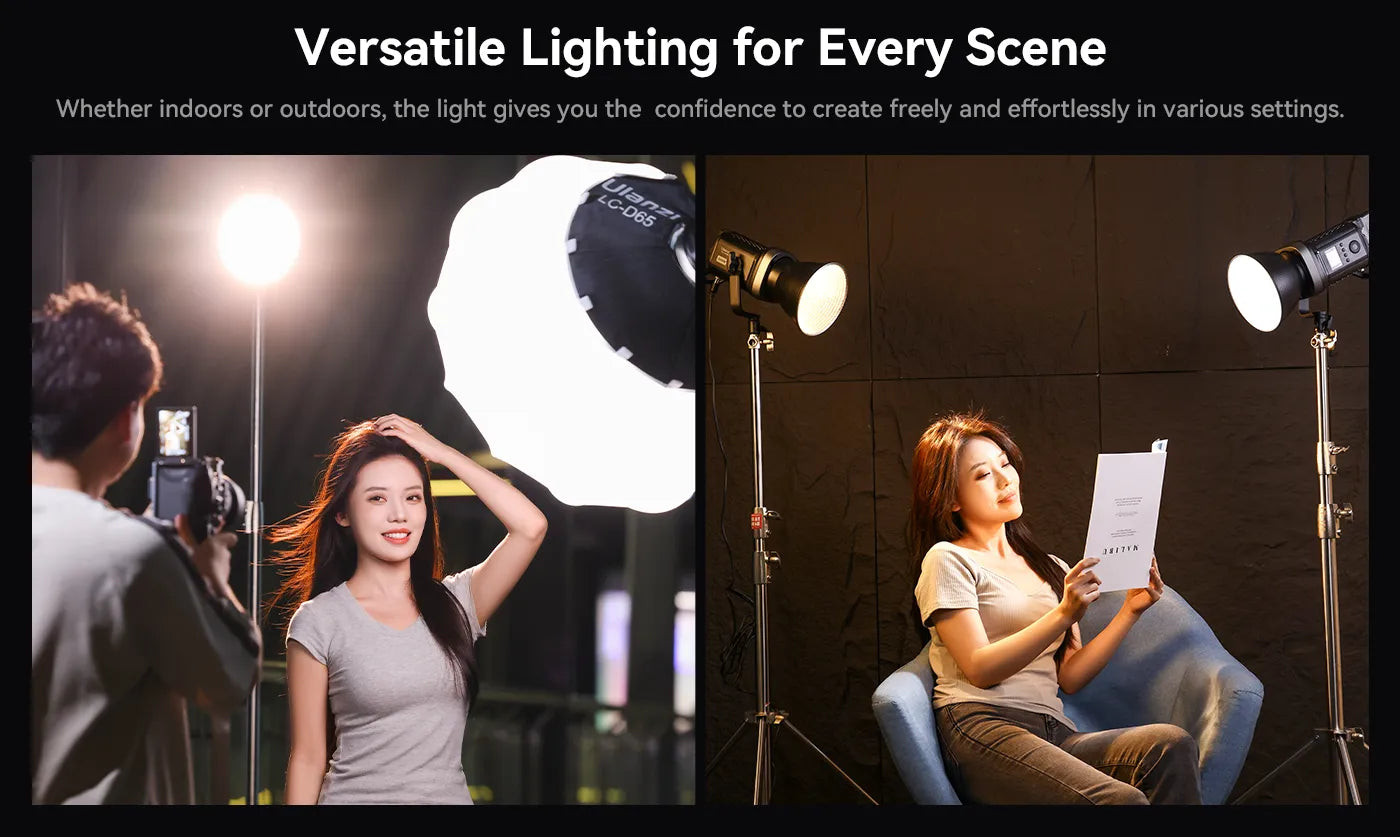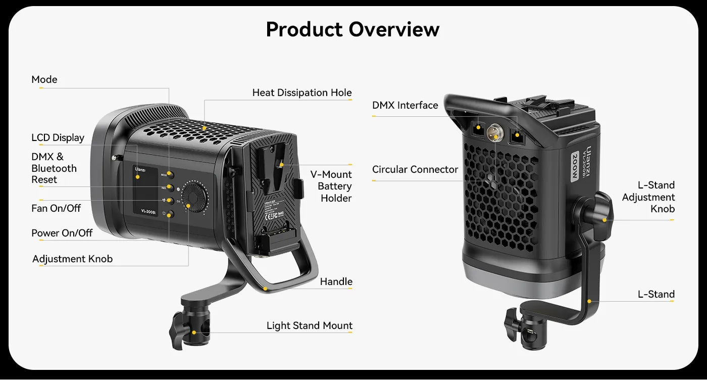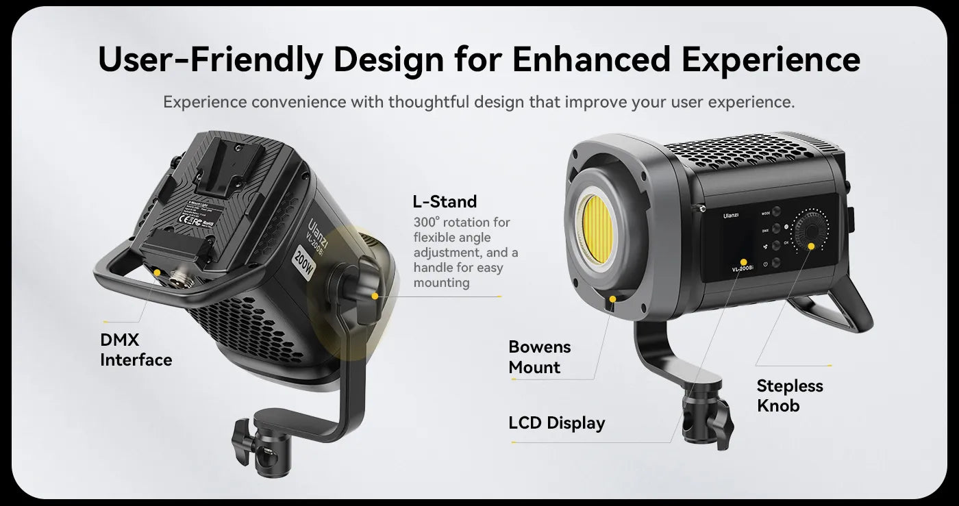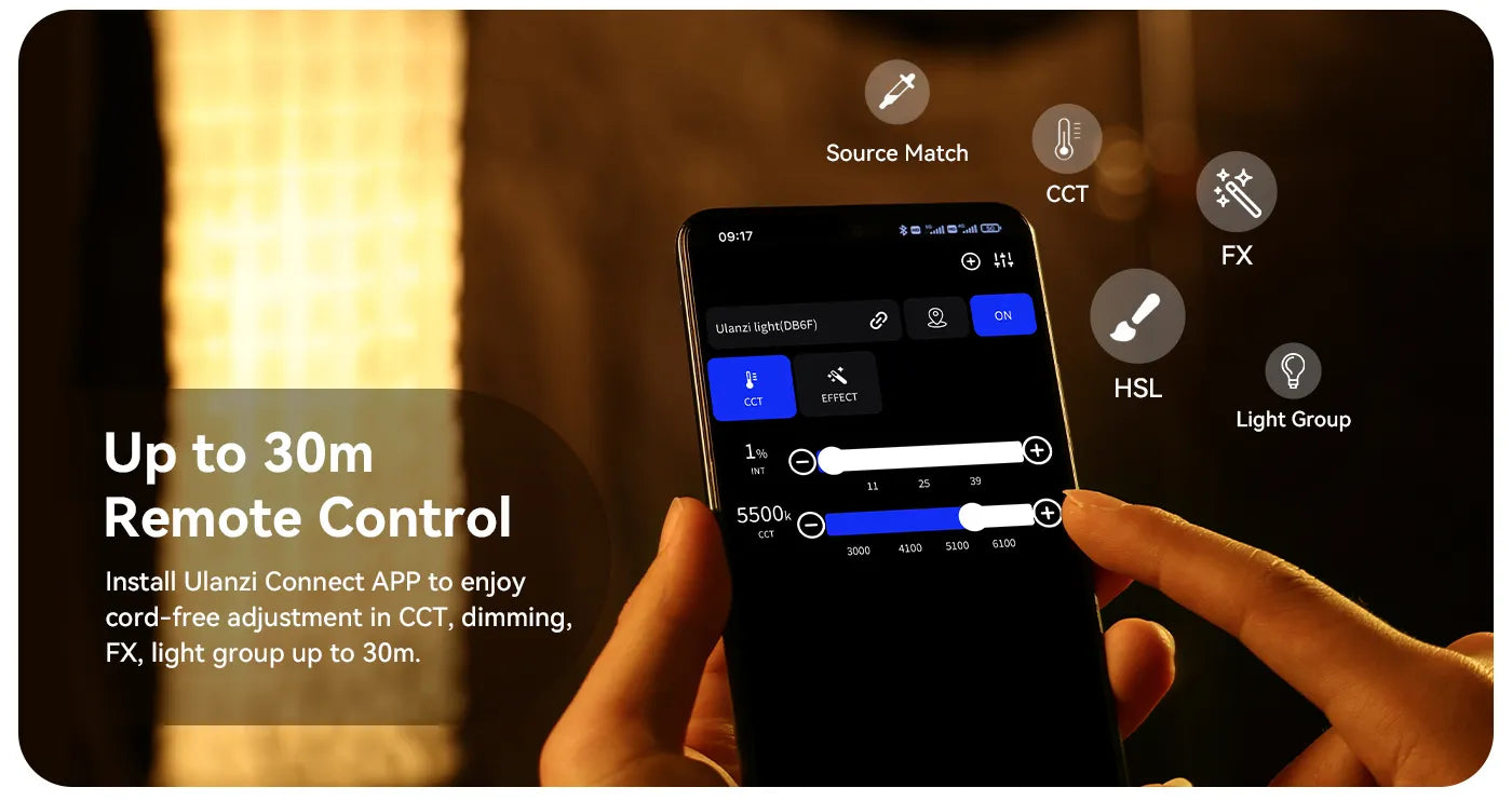 S pomočjo aplikacije Ulanzi Connect lahko upravljate osvetlitev do 30 m stran. Uporabniku prijazen dizajn vključuje LCD-zaslon, brezstopenjski gumb, 300° vrtljiv L-stojalo, Bowens-nosilec in DMX-vmesnik za upravljanje več svetil.