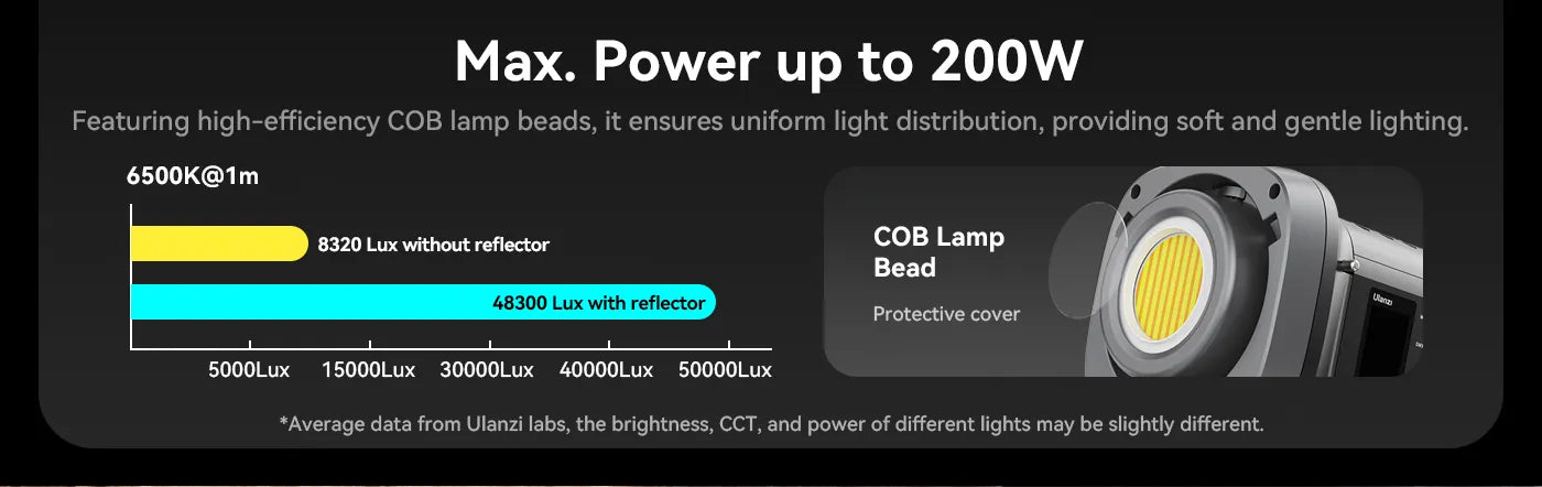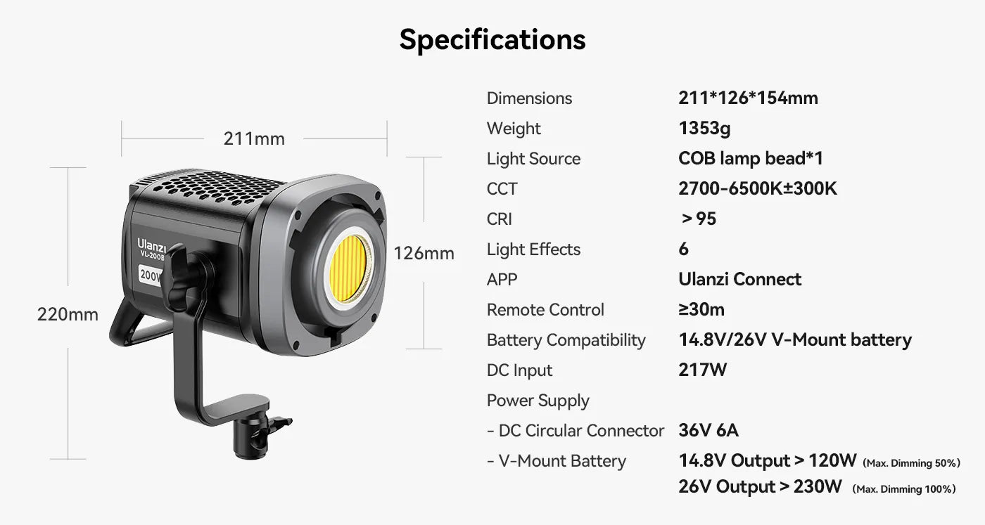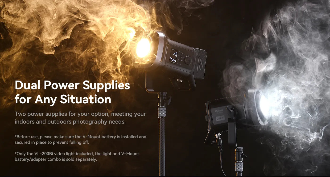 Ulanzi VL-200Bi 200W V-Mount Video Light ponuja vsestransko osvetlitev za vsako sceno, idealno za snemanje porok, kratke videe, livestreaming e-trgovine in fotografiranje izdelkov. Opremljen je z visoko učinkovitimi COB-žarnicami, ki zagotavljajo enakomerno, mehko osvetlitev z močno svetilnostjo 48300 Lux pri 6500K@1m z reflektorjem.