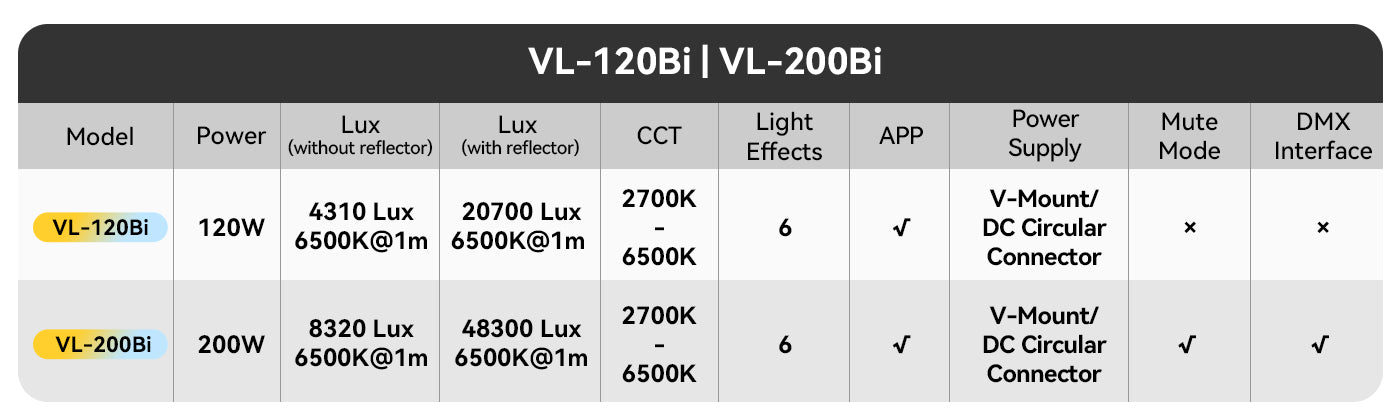 - VL-200Bi luči se prodajajo ločeno od kombinacij baterij/adapterjev V-Mount.