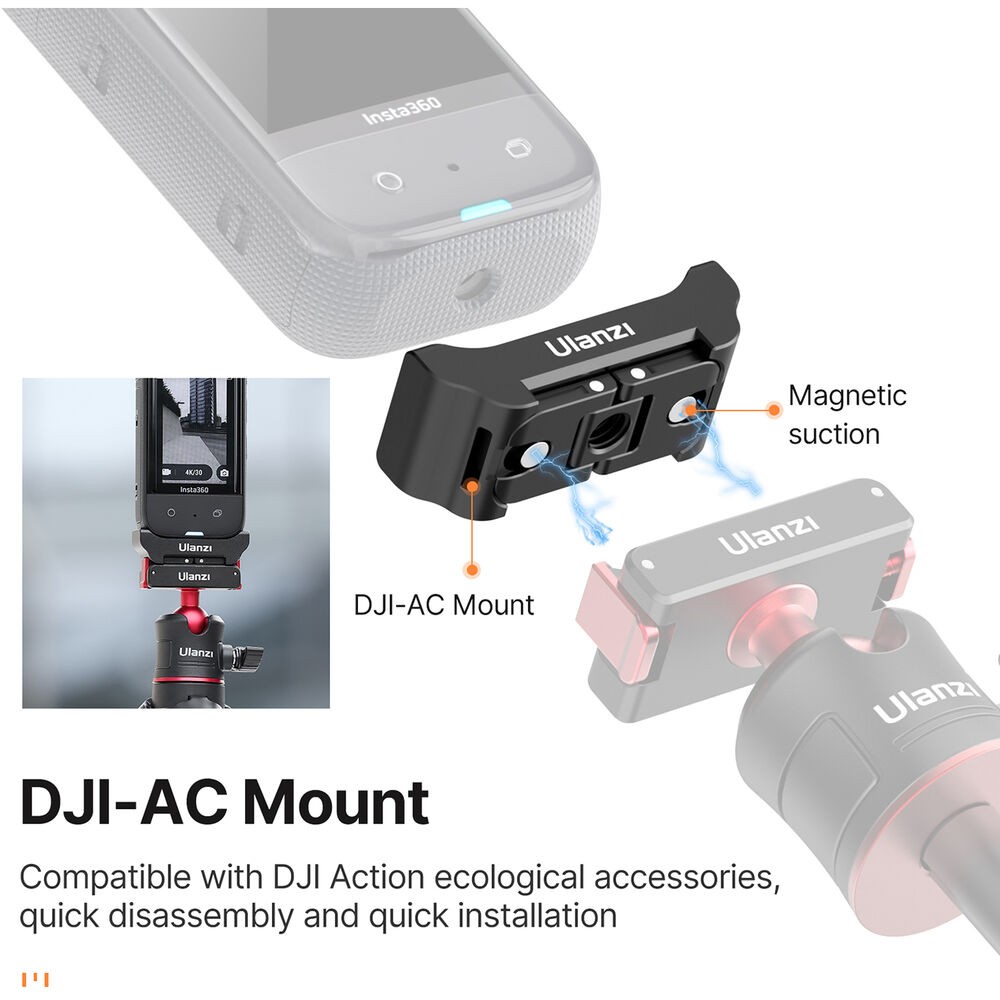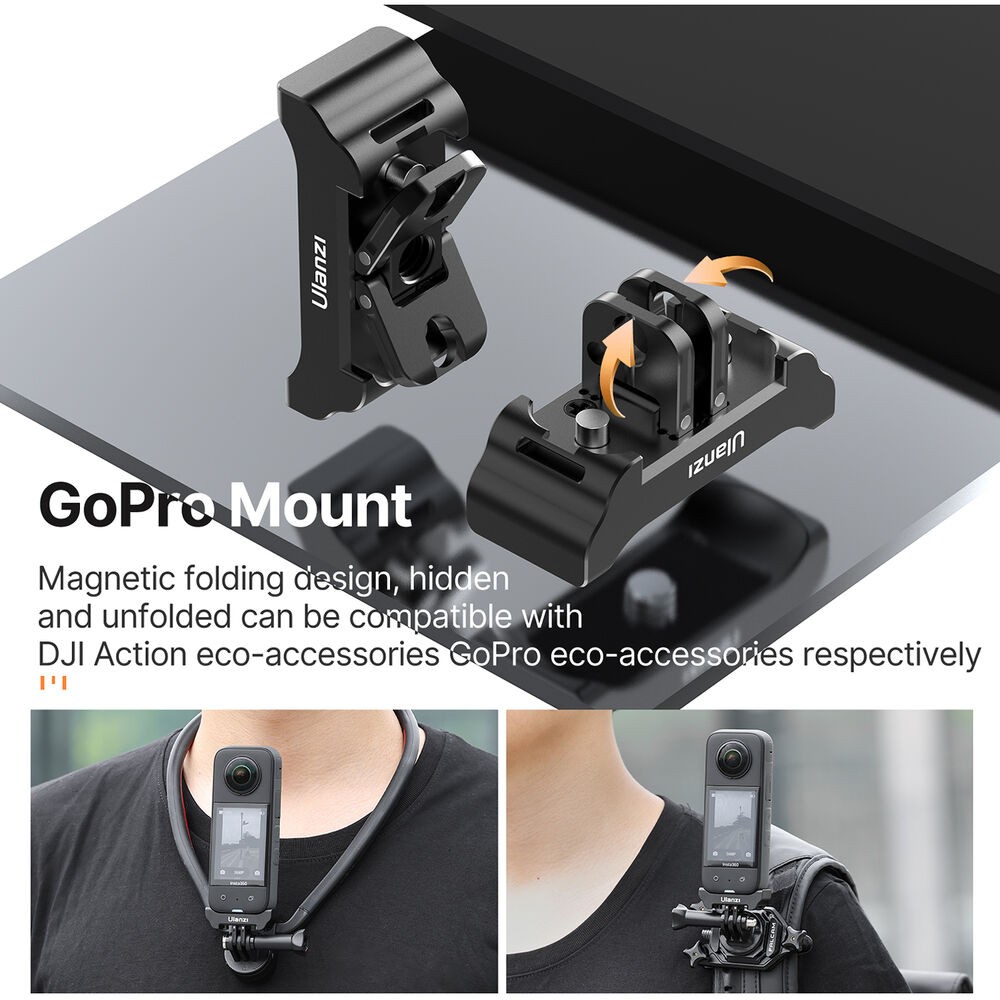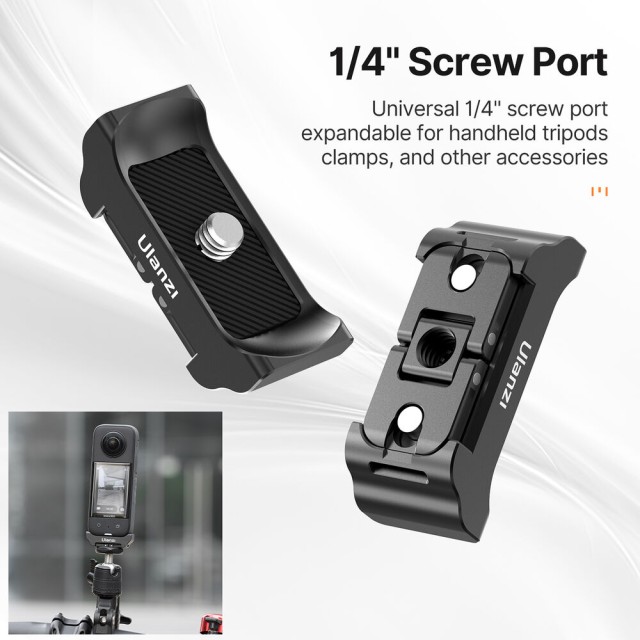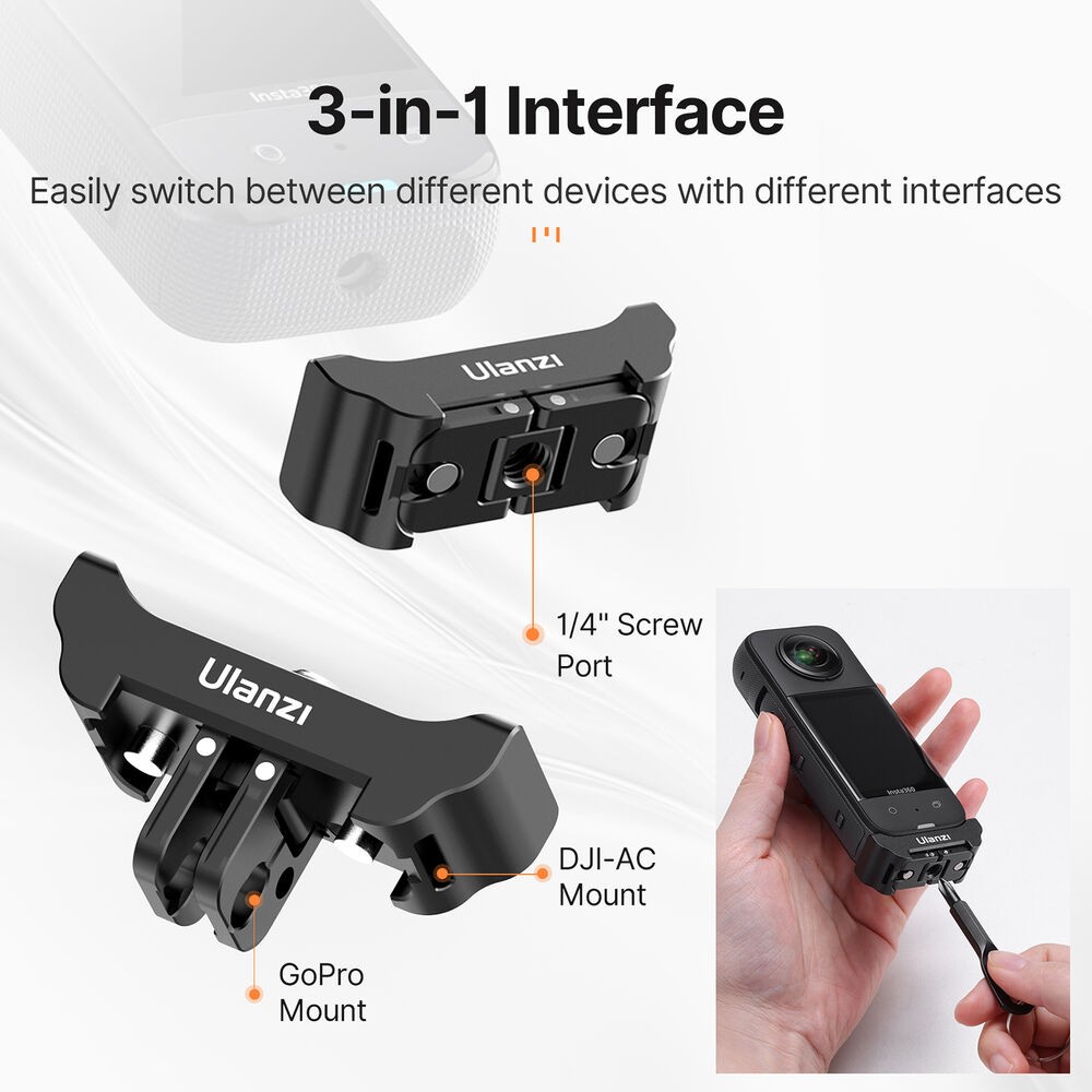 S pomočjo adapterja Ulanzi 3-v-1 Quick Release lahko svojo akcijo kamero Insta360 X3 ali X2 hitro in varno namestite na stative, nosilce ali magnetne dodatke DJI. Ta kompakten adapter z zložljivim 2-zobnim nosilcem, navojem 1/4"-20 in magnetnim nosilcem DJI združuje vsestranskost, vzdržljivost in zaščito za vašo kamero.