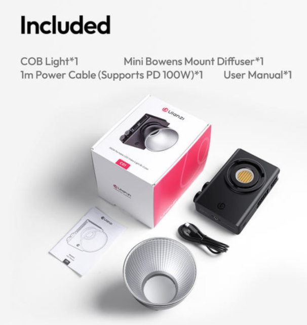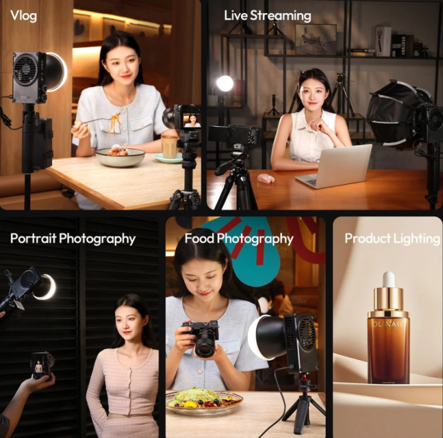 Zasnovan za neprekinjeno uporabo, votla konstrukcija z visokohitrostnim ventilatorjem zagotavlja učinkovito hlajenje, ohranja stabilno svetlobo in preprečuje pregrevanje med dolgimi snemanji. C01 je združljiv z Mini Bowens nosilci in deluje z reflektorji, softboxi in svetlobnimi modifikatorji, da poveča vaše ustvarjalne možnosti.