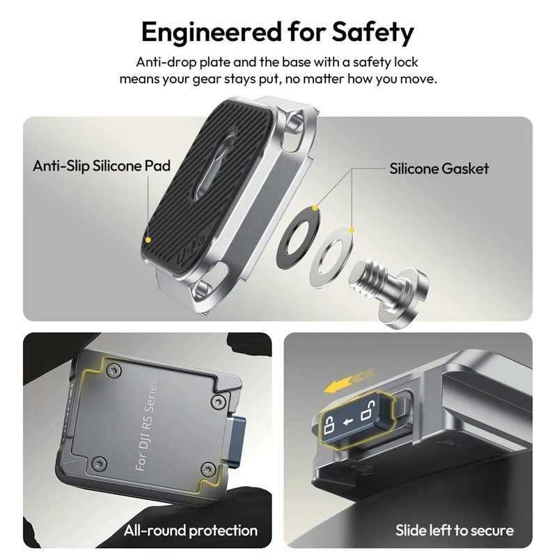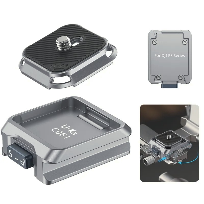 Komplet za hitro sprostitev Ulanzi C061 Uka za serijo DJI RS je zasnovan za poenostavitev postopkov namestitve kamere za filmarje in ustvarjalce vsebin, ki uporabljajo stabilizatorje DJI RS. Ta vsestranski sistem za hitro sprostitev, zasnovan za združljivost z DJI RS 2, RS 3, RS 3 Pro, RS 4, RS 4 Pro in RS 4 Mini, vam omogoča namestitev in odstranitev kamere v nekaj sekundah, hkrati pa ohranja največjo stabilnost.