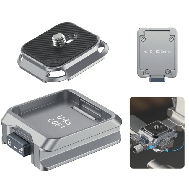 Ulanzi C061 Uka Quick Release Kit je kompakten, visoko trden sistem za hitro sprostitev, zasnovan za stabilizatorje DJI serije RS, ki omogoča hitro vstavljanje, varno zaklepanje in brezhibno združljivost s sistemi Uka in F38 za učinkovito preklapljanje kamere.