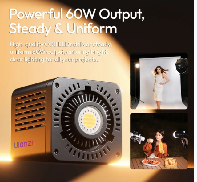 Video luč Ulanzi C60RGB 60W RGB COB LED je kompaktna, profesionalna rešitev za osvetlitev, namenjena ustvarjalcem. Z polnim RGB-spektrom in nastavljivo belo/toplo svetlobo, vgrajeno baterijo zmogljivosti 3300 mAh, 20 načini simulacije prizorov ter združljivostjo z mini Bowens-priključkom zagotavlja močno in vsestransko osvetlitev za portrete, vloge, neposredne prenose in filmske vsebine.