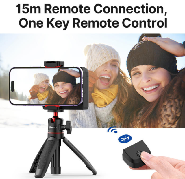 Za dodatno udobje ima držalo snemljiv daljinski upravljalnik Bluetooth z brezžičnim dometom do 15 metrov. Takoj se poveže z večino pametnih telefonov, ne da bi bilo treba prenesti kakršno koli aplikacijo, kar olajša zajemanje fotografij ali začetek snemanja na daljavo. Ergonomsko oblikovan ročaj z mehko silikonsko površino zagotavlja večjo stabilnost in zaščito pred tresljaji, hkrati pa ostaja udoben za daljšo uporabo z eno roko.