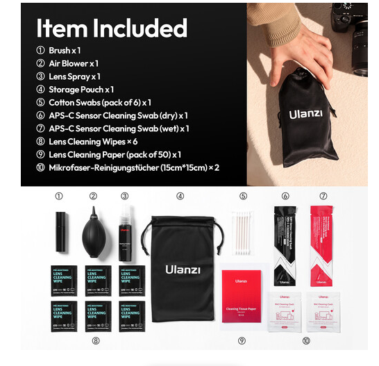 Čistilni komplet Ulanzi CO72 10-v-1 je idealna rešitev za fotografe in videografe, ki želijo svoje APS-C kamere in objektive ohraniti v brezhibnem stanju. Ta vsestranski komplet vsebuje vsa potrebna orodja za čiščenje, vključno z mokrimi in suhimi krpami za senzorje, ki so posebej zasnovane za APS-C senzorje, ter različne dodatke, ki zagotavljajo, da vaša oprema ostane brez madežev.