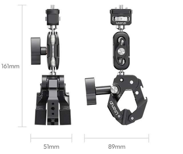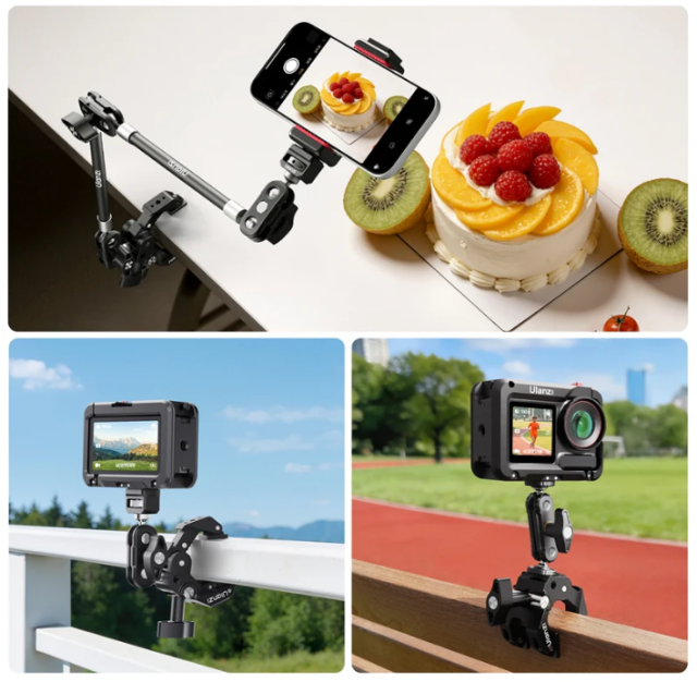 Njegova robustna super sponka ima zasnovo s tremi čeljustmi, ki zagotavlja trden oprijem na ravnih in okroglih površinah, medtem ko priloženo magic arm z dvojno kroglasno glavo omogoča polno 360° pozicioniranje. To omogoča enostavno doseganje kreativnih kotov, kot so posnetki z višine, osvetlitev iz nizkega kota ali namestitve monitorjev na strani.