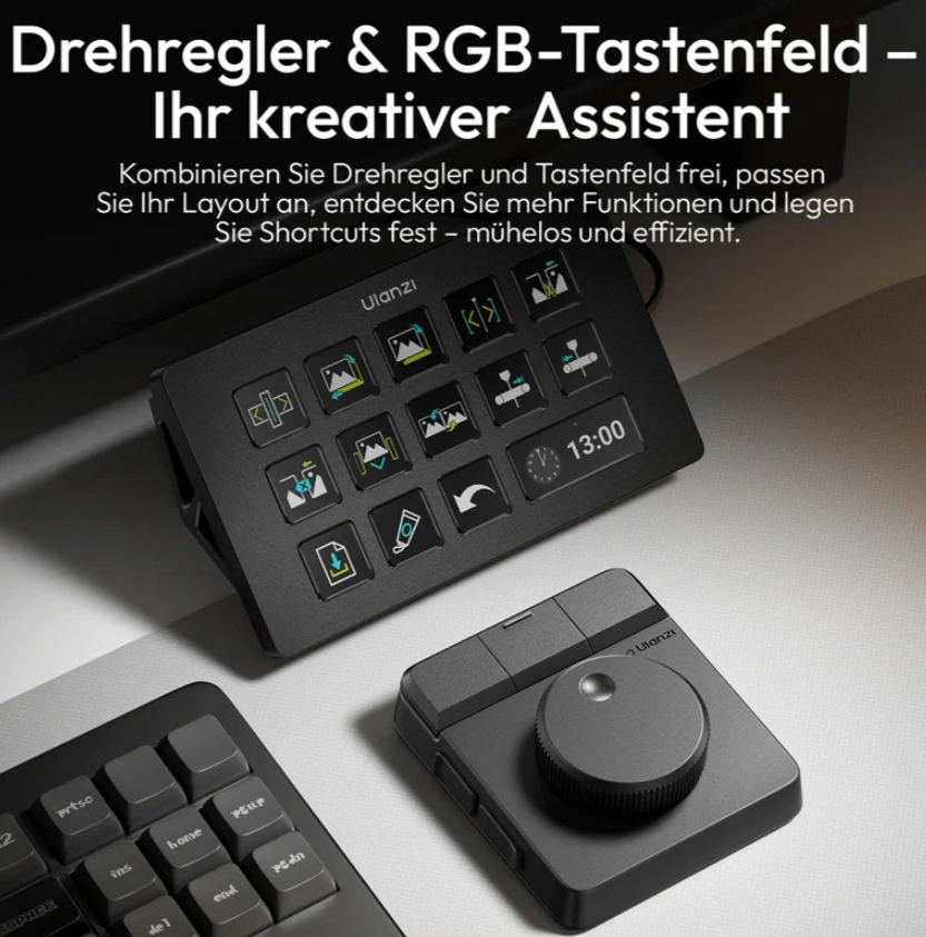 Kreativni krmilnik Ulanzi D100H Dial (I003) je popolnoma prilagodljiva RGB-tipkovnica z vrtljivim gumbom, zasnovana za izboljšanje vašega delovnega toka pri urejanju videov, fotografij in barvnem korekcijskem obdelovanju. Z gumbi s haptičnim povratnim odzivom, brezžično povezljivostjo prek Bluetooth 5.0 in brezhibno integracijo z aplikacijo Ulanzi Connect omogoča natančno upravljanje programske opreme in pametne razsvetljave, zaradi česar so ustvarjalne naloge hitrejše, bolj tekoče in bolj intuitivne.