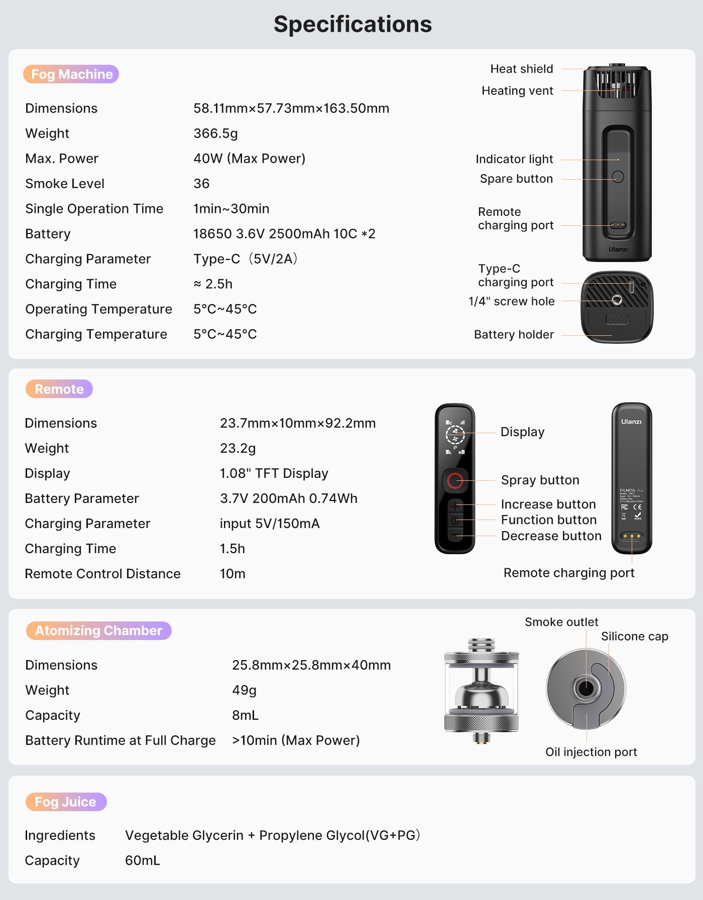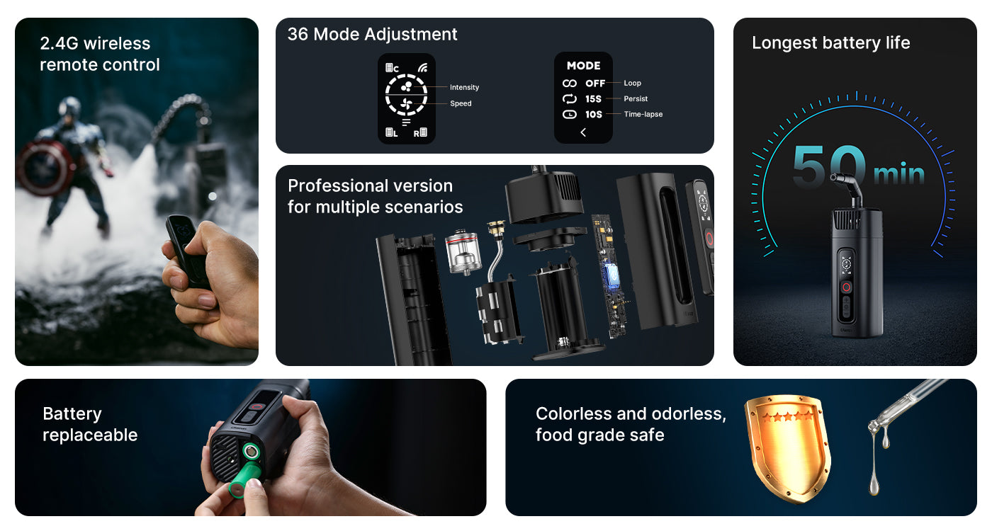 Ulanzi FM01 FILMOG Ace prenosni megleni stroj, dimni stroj z 36 meglenimi učinki različnih intenzivnosti, 40 W megla z daljinskim upravljalnikom (do 10 metrov), prenosni ročni megleni stroj, idealen za fotografijo, dogodke na prostem, zabave, odrske učinke, noč čarovnic ali poroke.