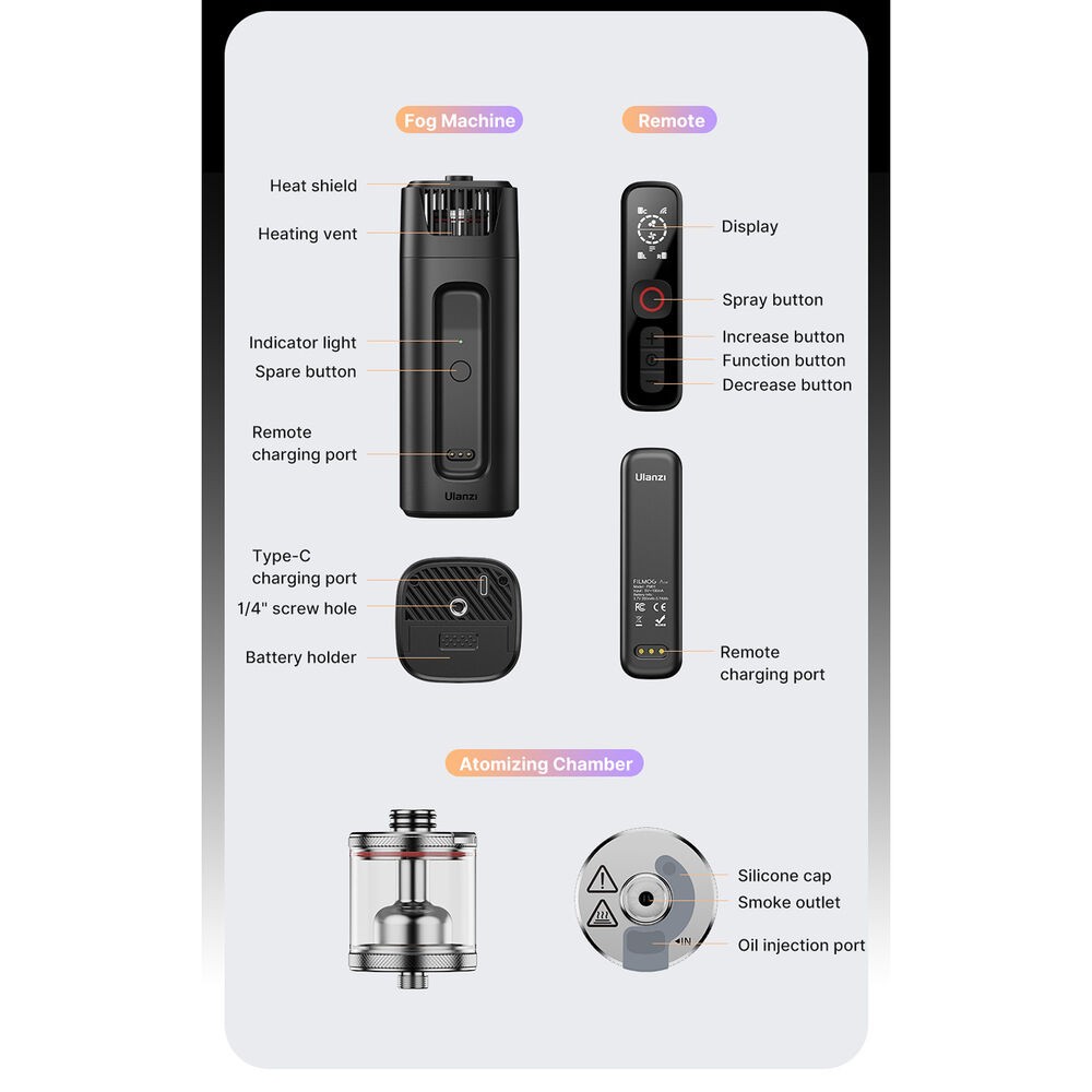 Prenosni megleni generator Ulanzi FM01 FILMOG Ace je kompakten, ročni megleni generator z 36 nastavljivimi načini megle, brezžičnim daljinskim upravljalnikom in USB-C priključkom za polnjenje. Idealno za fotografijo, dogodke ali odrske efekte, je lahek, prenosljiv in vključuje zaščitno torbo za prenašanje. (Meglena tekočina in baterije niso vključene.)