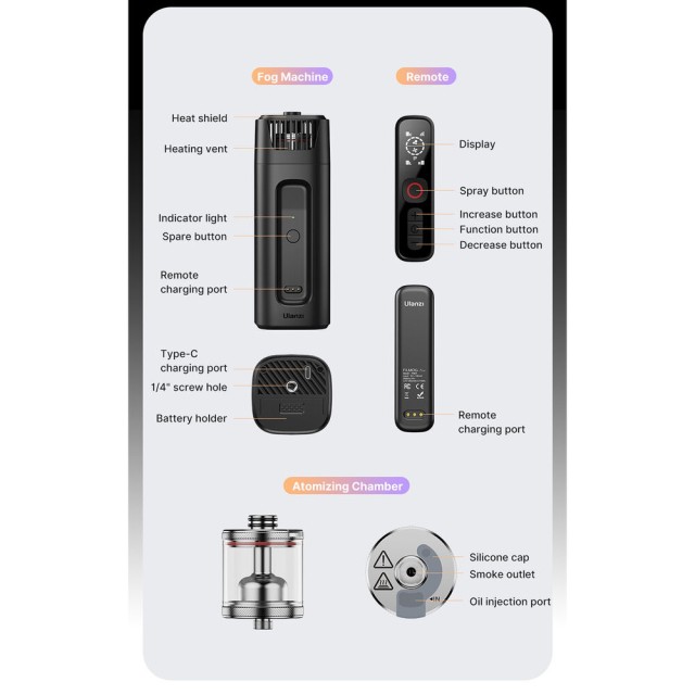 FM01 ima preprost vmesnik z barvnim zaslonom, ki omogoča enostavno izbiro načina in nastavitve. Vključuje brezžični daljinski upravljalnik 2,4 GHz, ki omogoča sproščanje megle z razdalje do 10 metrov. Naprava deluje na dveh baterijah 18650 (niso vključene) ali prek polnjenja USB-C, kar zagotavlja prilagodljive možnosti napajanja in do 50 minut delovanja.