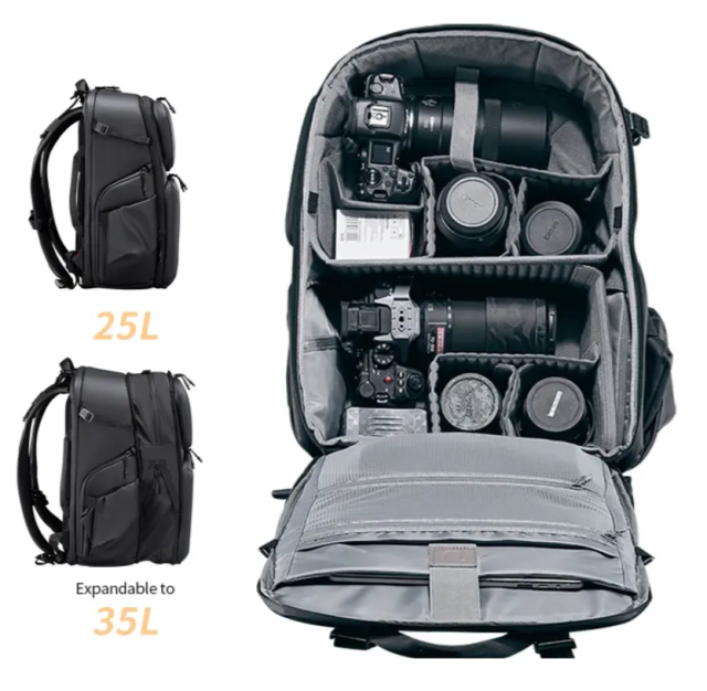 Ulanzi BP10 Hardshell Camera Backpack 35L je profesionalna torba za fotoaparat, zasnovana za potrebe fotografov in ustvarjalcev vsebin, ki potrebujejo varno, prostorno in vsestransko shranjevanje svoje opreme. Z zmogljivostjo 35 litrov, ki jo je mogoče razširiti na 40 litrov, je BP10 zasnovan tako, da lahko udobno sprejme do 2 kameri, 6 objektivov in dodatno opremo, kot je dron, kar ga naredi idealno rešitev za fotografe, ki so veliko na poti. Prilagodljive predelne stene vam omogočajo, da notranjost prilagodite svojim potrebam, tako da je vse organizirano in lahko dostopno.