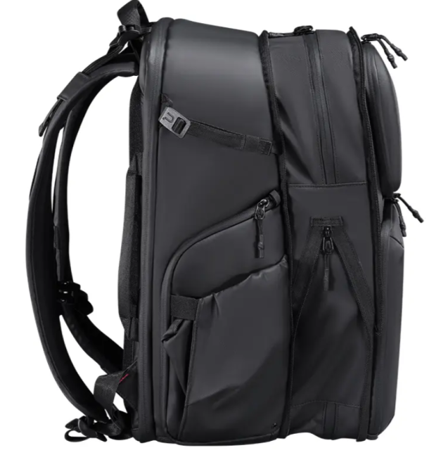 Nahrbtnik je izdelan iz vrhunske vodoodporne poliestrske vlaknine in ima izboljšano trdo zaščito, ki nudi vrhunsko zaščito pred vremenskimi vplivi, hkrati pa ima tudi protivlomne in protizgubne lastnosti. Ergonomsko oblikovana zadnja stran v obliki loka in nastavljivi ramenski trakovi, prsni trak in pas zagotavljajo udobje tudi med dolgimi snemanji ali potovanji. Za dodatno udobje ima torba dvojne stranske zadrge za hiter dostop, ki omogočajo dostop do opreme, ne da bi bilo treba odstraniti celoten nahrbtnik. Torba ima tudi ločene predale za suho in mokro opremo, ki omogočajo ločevanje občutljive opreme in vlažnih predmetov, ter prilagodljiv sistem razširitve z zankami in trakovi za enostavno izvlekanje opreme in možnosti nošenja. Več dvojnih ročajev za nošenje omogoča prilagodljivost pri nošenju nahrbtnika na različne načine, kar je idealno za različne potovalne in fotografske situacije.