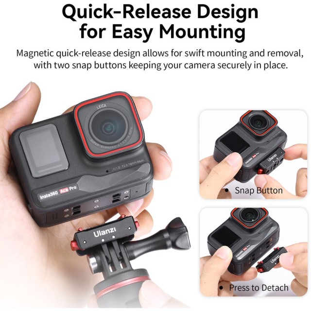 Magnetna podlaga za hitro snemanje Ulanzi IN-03 je ultratanka, lahka rešitev za pritrditev izbranih kamer Insta360, ki ima varen magnetni sistem za hitro snemanje, ki omogoča hitro pritrditev, enostavno odstranjevanje in nemoteno preklapljanje med 1/4"-20 in 2-prstnimi nosilci – idealno za nevidne 360° posnetke in ustvarjalce, ki so vedno na poti.