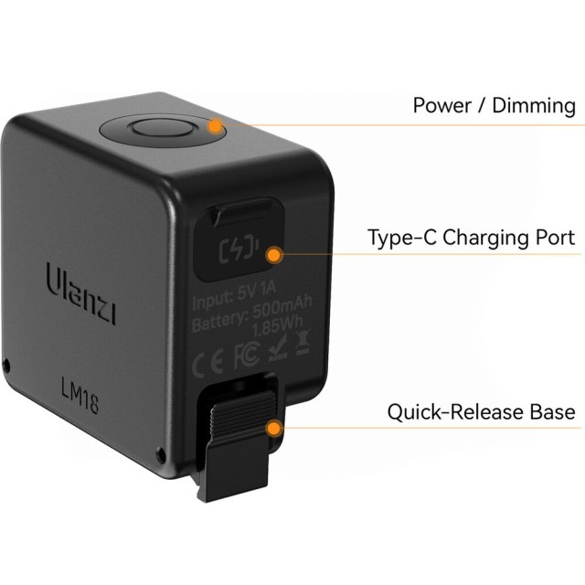 LM18 se napaja z vgrajeno 500 mAh polnilno baterijo in lahko deluje od 1 ure pri največji svetlosti do 8 ur pri minimalni moči. Svetilka je v celoti polnilna prek USB-ja in je opremljena z USB-polnilnim kablom. Njena trpežna, lahka zasnova vključuje stopnjo vodotesnosti IPX5 za uporabo v dežju ali vlažnih pogojih, medtem ko DJI-jev sponka za hitro sprostitev omogoča enostavno pritrditev na kamere Osmo Action ali Pocket. LM18 je idealna za vlogerje, ustvarjalce vsebin in akcijskih snemalce, ki iščejo prenosno, zanesljivo dopolnilno svetlobo.