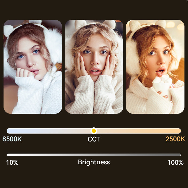 - nastavljiva barvna temperatura 2500K-8500K: Razširite svoje fotografske obzorje z vsestranskim nadzorom barve in svetlosti. Preklapljajte med toplimi, nevtralnimi in hladnimi barvnimi temperaturami (2500K-8500K) in natančno nastavite svetlost (10-100 %), da dosežete popolno osvetlitev za vsak posnetek.