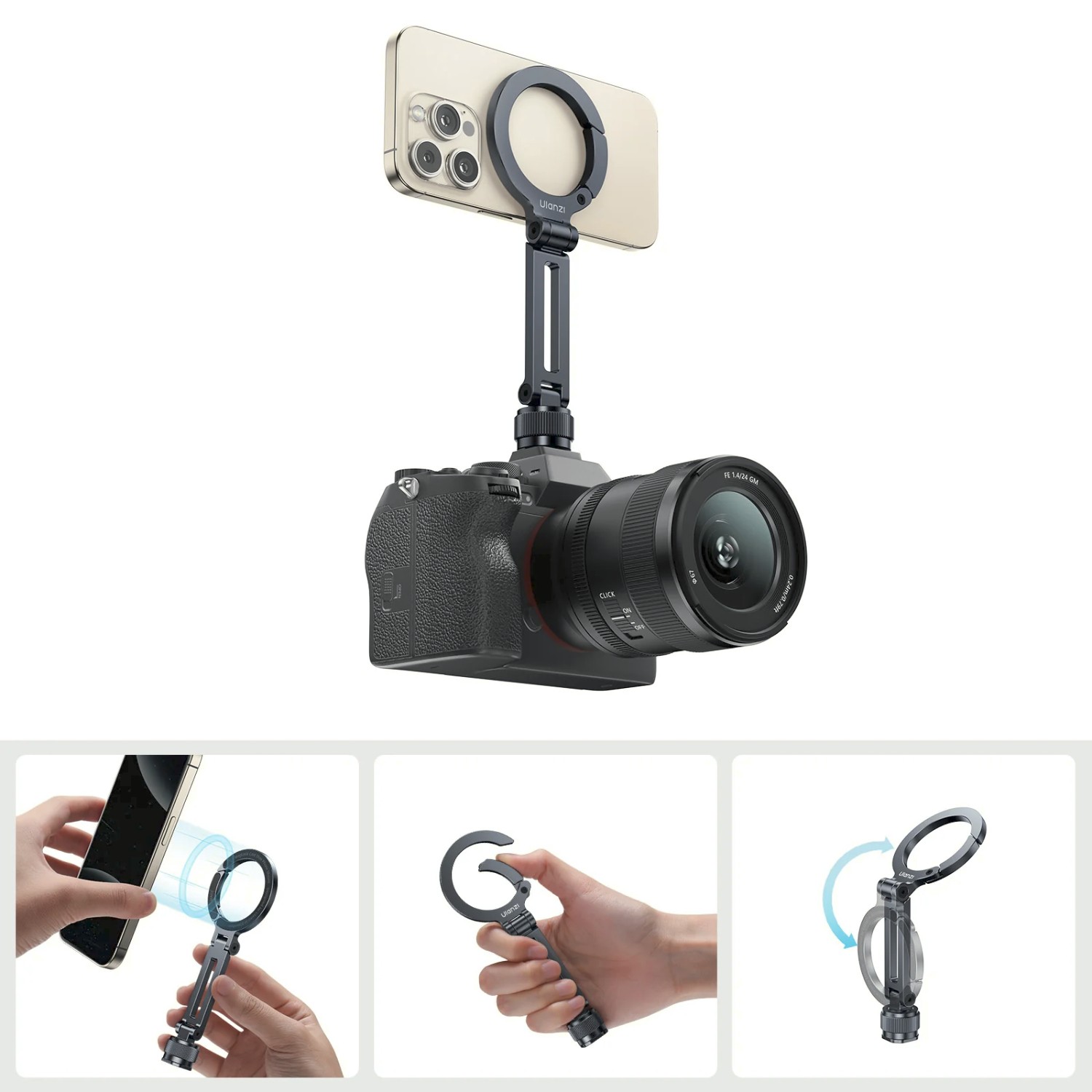 Ulanzi MA07 MagLock 1/4 Cold Shoe Bracket je vsestranski, zložljiv stojalo za telefon in nosilec za dodatke, ki omogoča enoročno pritrditev MagSafe, gladko vrtenje in nagibanje ter univerzalno združljivost s 1/4"-20 in hladno stopalko. Kompakten, lahek in primeren za potovanja, je idealen za neposredno predvajanje, intervjuje, snemanje z dvema zaslonoma in ustvarjalne mobilne nastavitve.