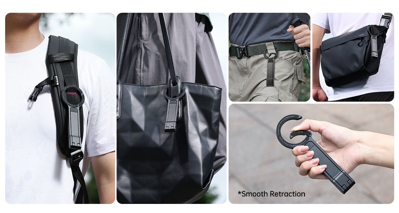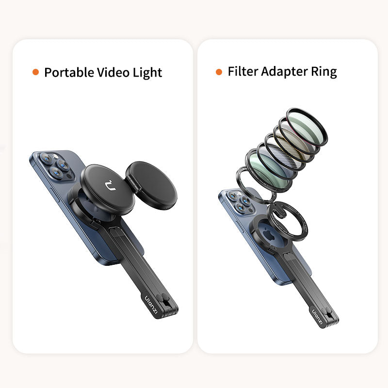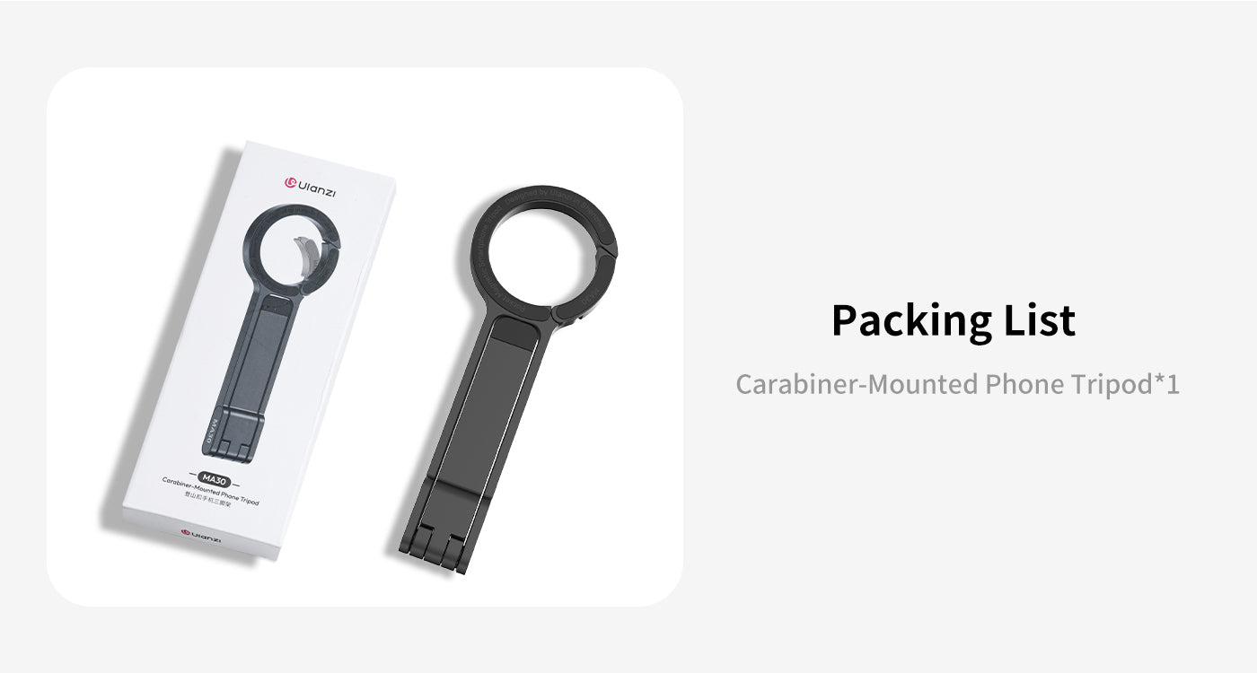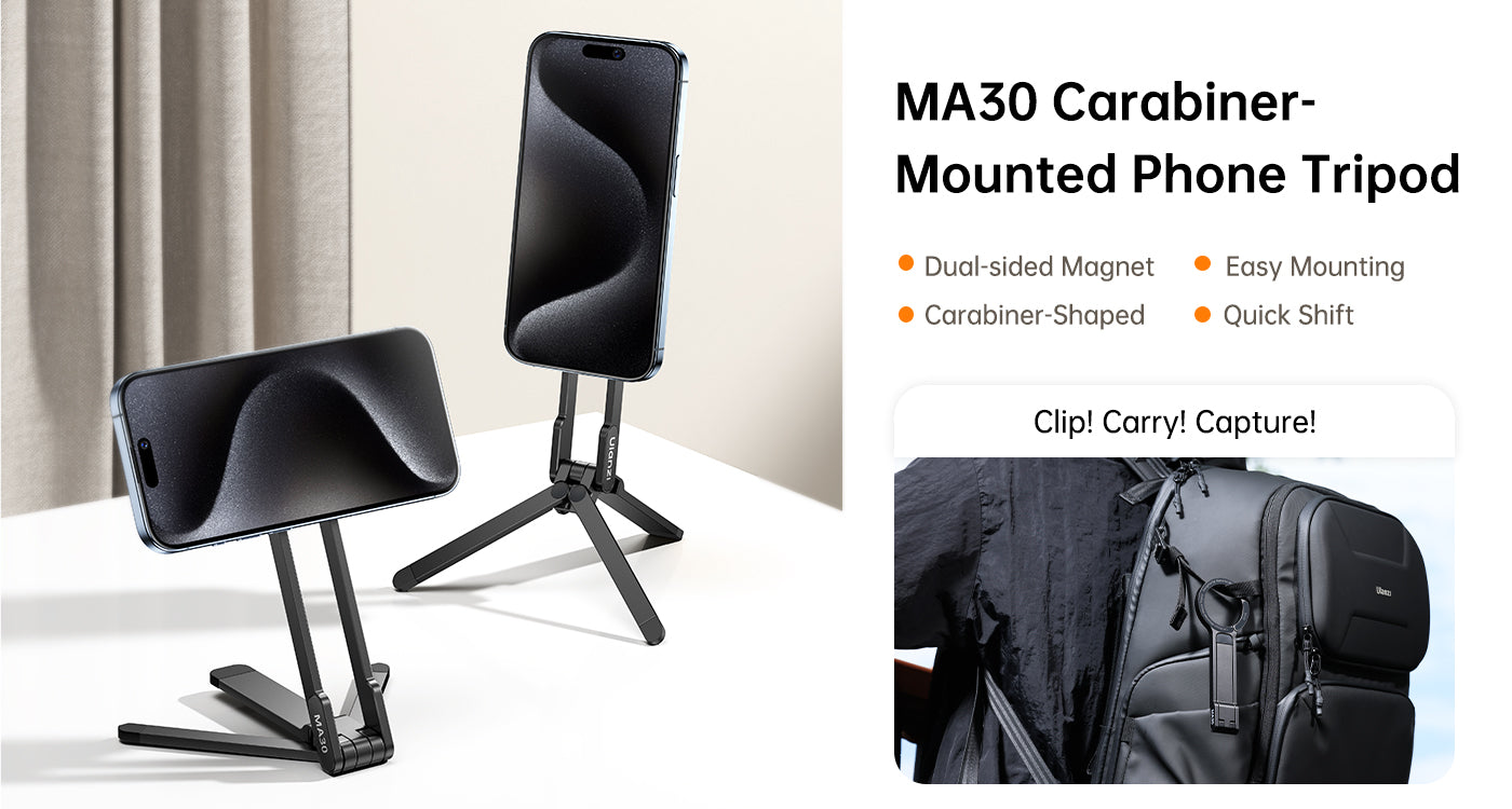 Ulanzi MA30 stojalo za telefon s karabinerjem – združljivo z MagSafe, izjemno prenosno in prijazno do ustvarjalcev. Pritrdite ga, zložite in snemajte. Ulanzi MA30 je stativ za telefon v obliki karabine, zasnovan za ustvarjalce, ki potrebujejo hitro namestitev, prilagodljive kote in kompaktno prenosljivost. Ne glede na to, ali snemate vlog na poti ali v ozkih prostorih, je ta MagSafe-združljiv nosilec pripravljen za pritrditev in snemanje.