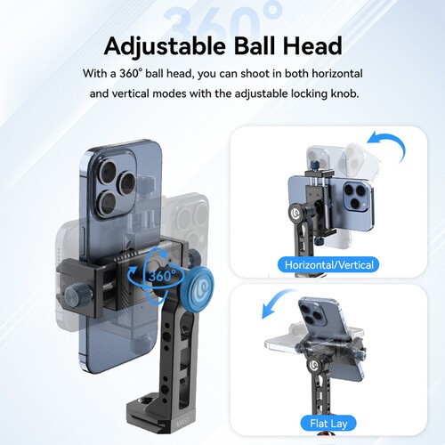 Nosilec za slušalke Ulanzi MA53 Ball Head Phone Mount zagotavlja profesionalno raven prilagodljivosti in stabilnosti za ustvarjalce pametnih telefonov. Izdelan je iz trpežnega aluminija in varno pritrdi pametne telefone širine od 2,4 do 3,7 palca s silikonskimi čeljustmi, ki vašo napravo ščitijo pred praskami in neželenim premikanjem.