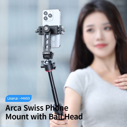 Ulanzi MA53 Arca Swiss Phone Mount je robusten aluminijasti nosilec za pametne telefone z vgrajeno kroglasto glavo in hitro snemljivo podlago tipa Arca. Zasnovan je za telefone širine 2,4–3,7 palca in omogoča gladko vrtenje za 360°, nastavitev v več kotih in obsežno razširitev dodatkov – idealno za mobilno snemanje filmov, neposredno predvajanje in fotografijo.