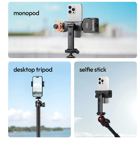 Ulanzi MA54 Uka Phone Holder je kompakten in zanesljiv nosilec za ustvarjalce vsebin, vlogerje in mobilne filmarje. Zasnovan je z integrirano Uka hitro snemljivo podlago, ki se brez težav pritrdi na združljive Uka stative in monopode, vgrajen 1/4"-20 notranji navoj pa razširja združljivost s standardnimi nosilci in dodatki. Vzmetna sponka varno drži pametne telefone širine od 2,4 do 4,1 palca (60–105 mm) in ima silikonsko obložene čeljusti za zaščito naprav in boljši oprijem. Za maksimalno prilagodljivost nosilec podpira 360° vrtenje in 180° nagib, kar omogoča enostavno preklapljanje med pokončno in ležečo usmeritvijo. Dve vgrajeni hladni čevlji omogočata enostavno pritrditev mikrofonov, LED-luči ali drugih dodatkov, kar MA54 naredi praktično rešitev vse v enem za ustvarjanje mobilnih vsebin.