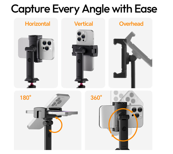 Ulanzi MA54 Uka Phone Holder je vsestranski nosilec za pametne telefone, zasnovan za ustvarjalce, z Uka podstavkom za hitro sprostitev, 360° vrtenjem, 180° nagibom in dvojnim hladnim nosilcem za dodatke. Varno drži pametne telefone širine od 2,4 do 4,1 palca in ponuja prilagodljive možnosti pritrditve za stative, monopode in stojala.