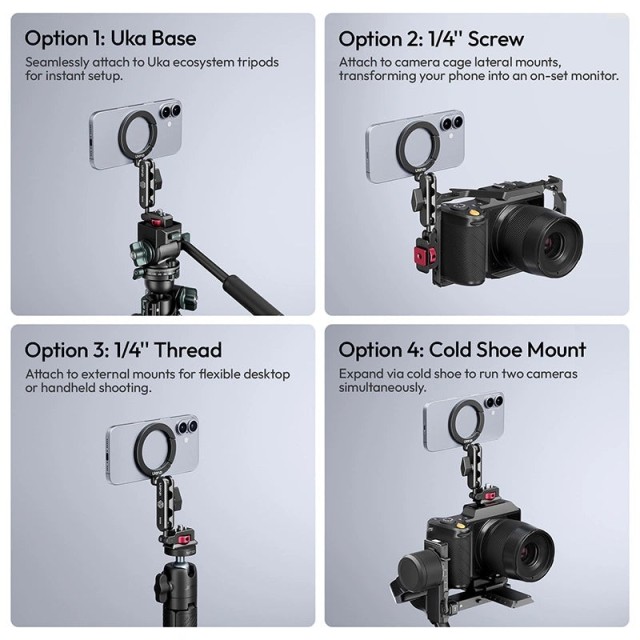 - 1/4'' vijak: Pritrdite jo na stranske nosilce ohišja kamere in tako svoj telefon spremenite v monitor na snemalnem prizorišču.