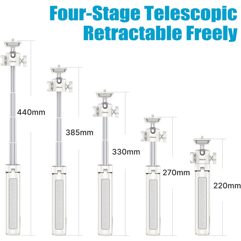 Ulanzi MT-42 je kompakten in vsestranski namizni stativ, ki se lahko uporablja tudi kot palica za selfije, idealna za vloganje, telekonference, samosnemanje in ustvarjanje mobilnih vsebin. Zaradi lahke konstrukcije, nastavljive kroglaste glave in 360° hladne stopalke je idealen za majhne kamere in pametne telefone.
