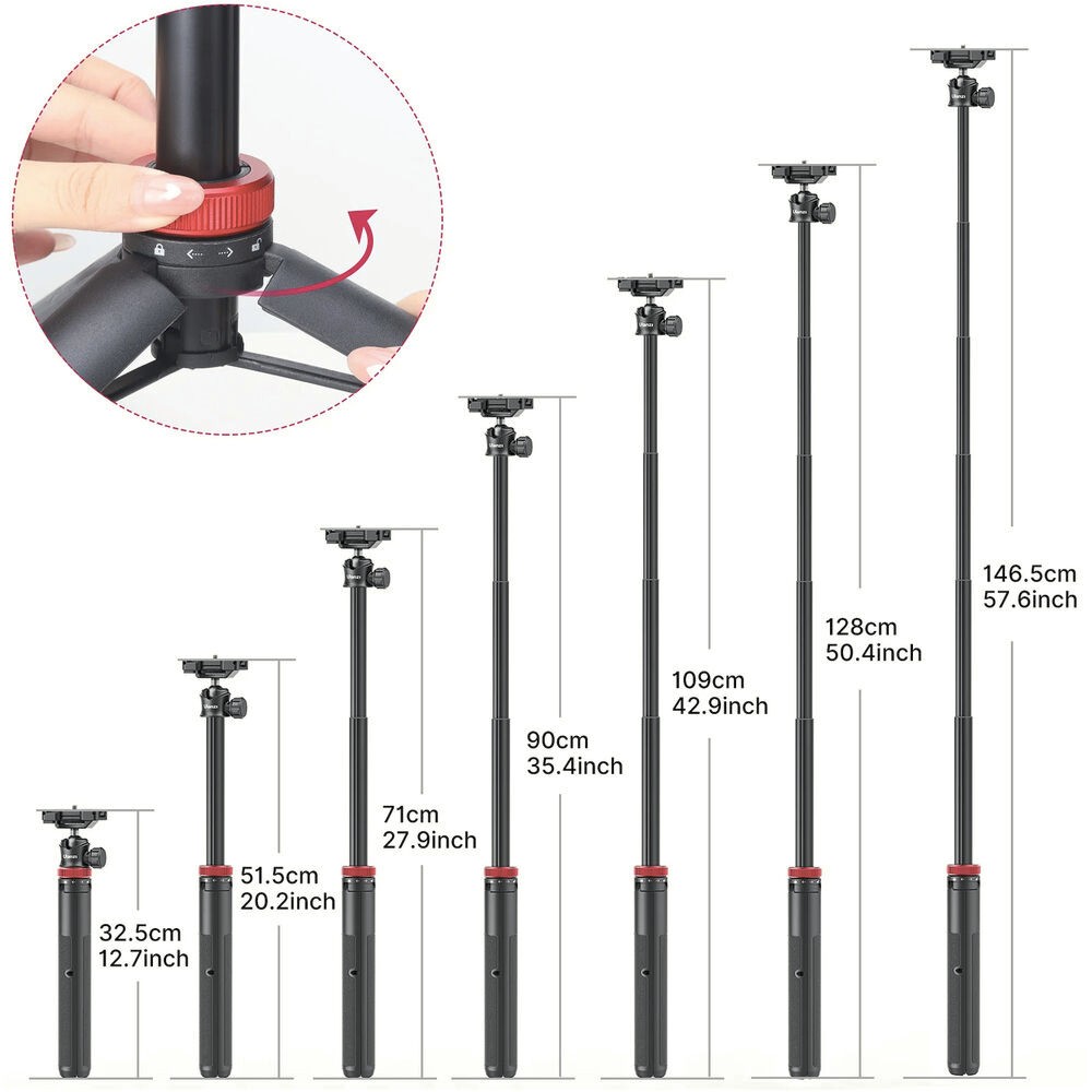 Ulanzi MT-44 raztegljiv vlog stativ V3 je zasnovan za ustvarjalce, ki potrebujejo kompaktno rešitev vse v enem za snemanje, pretakanje in fotografiranje. Stativ ima 6-delni teleskopski srednji steber in se razteza od 34 cm do 149 cm, kar omogoča zadostno višino za snemanje stoje, vloge in širokokotne posnetke. V zloženem stanju meri le 32,5 cm, kar omogoča enostavno shranjevanje v nahrbtnikih ali torbah za kamere.