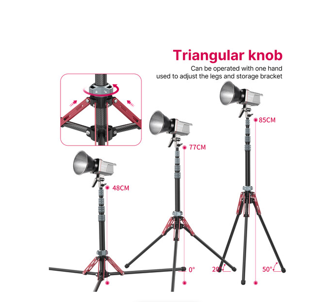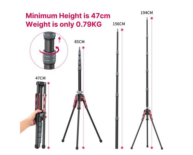 Prenosni svetlobni stoj / foto- in videostativ Ulanzi MT-49 iz ogljikovih vlaken (1,9 m) je lahka, a trpežna rešitev za podporo, zasnovana za fotografe in videografe, ki so veliko na poti. Izdelan je iz ogljikovih vlaken, nosilnost pa znaša do 6 kg, ko je raztegnjen na 1,94 m; za lažji prevoz se lahko kompaktno zloži. S snemljivim srednjim stebrom, ki se lahko spremeni v monopod, ponuja izjemno vsestranskost tako za snemanje v studiu kot na prostem.