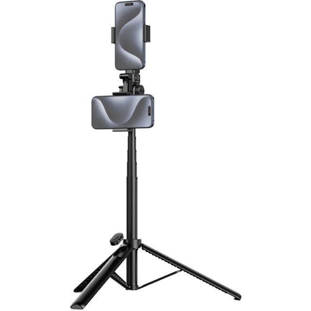 Ulanzi MT-70 360° vrtljivi stojalo za dve kameri je večnamenski dodatek za pametne telefone in majhne kamere, zasnovan za ustvarjalce vsebin, vlogerje in livestreamerje. Njegov 7-delni aluminijasti drog se razteza od 32 cm do 158 cm, kar omogoča uporabo kot palico za selfije, ročaj ali samostojni stativ.