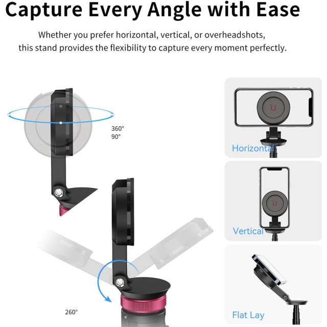Z mini stativom Ulanzi MT-84 za MagSafe lahko kjerkoli posnamete popolne posnetke. Ta pretvorljiv stativ deluje tudi kot palica za selfije, saj ima magnetni nosilec, združljiv s telefoni in ovitki MagSafe. Nosilec se lahko vrti za 360° in obrača za 90° za navpično ali vodoravno usmeritev, kar omogoča prilagodljive kote snemanja. Z robustno nosilnostjo 1 kg lahko podpira telefone z dodatno opremo, kot so mikrofoni ali LED-luči. MT-84 je izdelan iz lahkega aluminija in trpežne plastike, razteza se do 60,2 palca za posnetke pod visokim kotom, medtem ko njegov snemljiv Bluetooth daljinski upravljalnik omogoča upravljanje brez rok do 32,8 čevlja. MT-84 je idealen za vlogerje, ustvarjalce vsebin in popotnike, saj omogoča enostavno zajemanje fotografij in videoposnetkov.