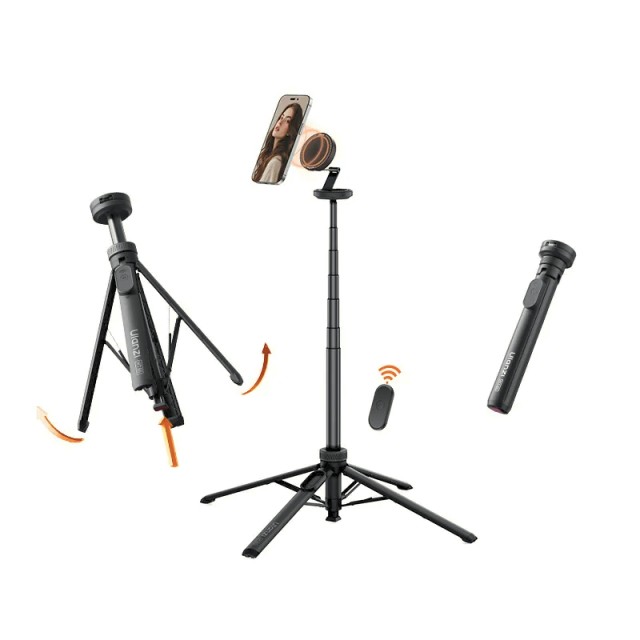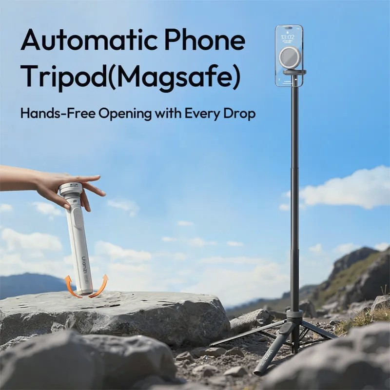 Ulanzi MT85 Black je avtomatski stativ za telefon z dvostranskim nosilcem, združljivim z MagSafe, štirinožno stabilnostjo in Bluetooth daljinskim upravljalnikom za prostoročno upravljanje. Kompakten, prenosljiv in raztegljiv do 1,5 m, je idealen za selfije, posnetke celega telesa, vloganje in neposredno predvajanje.