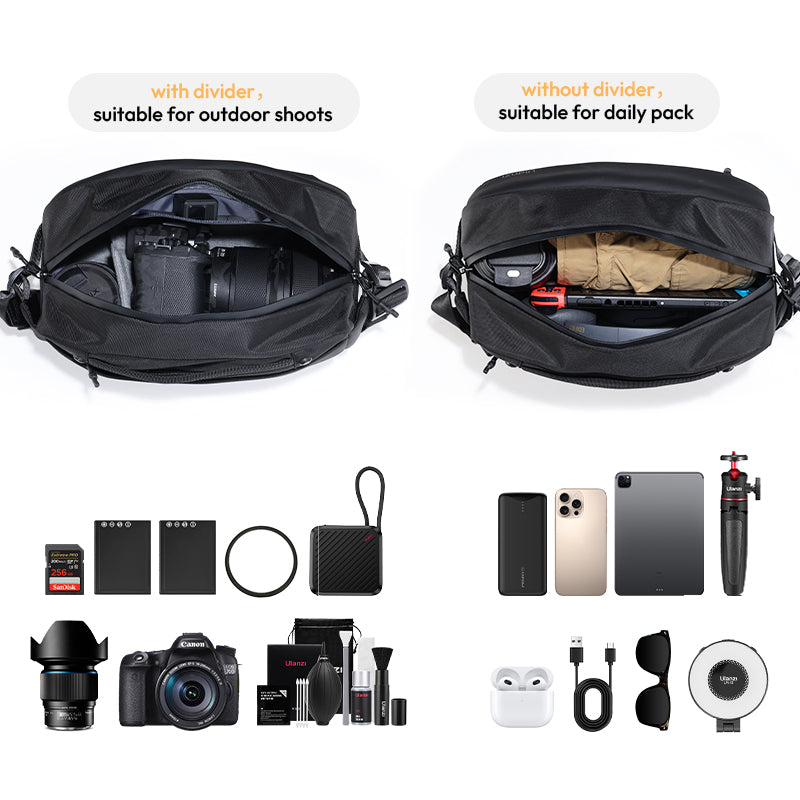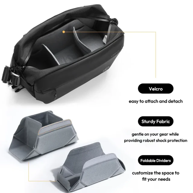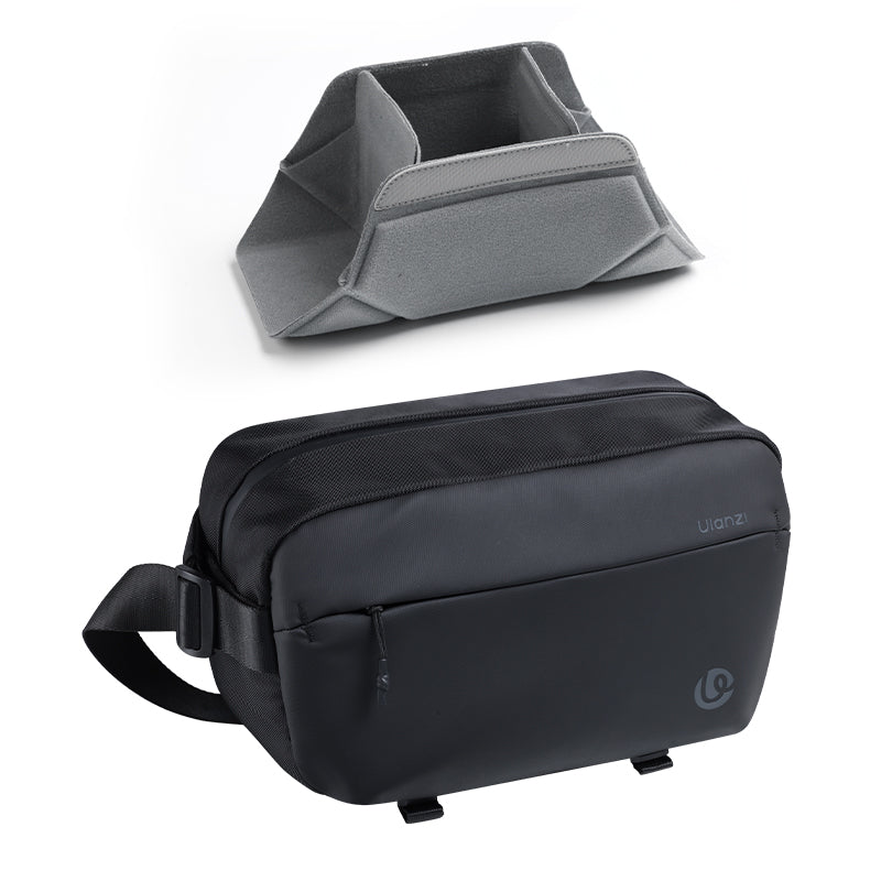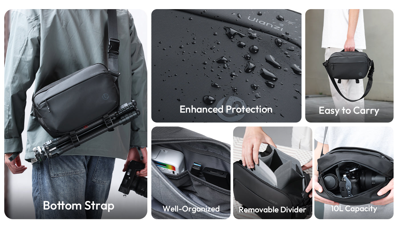 Torba za fotoaparat Ulanzi B120 ponuja 10 litrov organiziranega prostora za fotografov in popotnike. Izdelana je iz vodoodporne tkanine in trpežnih zadrg, ki vašo opremo zaščitijo v vsakem vremenu. Več predalov, žep za tablico in snemljiva pregrada omogočajo enostavno preklapljanje med fotografiranjem in vsakdanjo rabo. Ta lahka torba z nastavljivim spodnjim trakom za stative je idealna za fotografiranje v mestu, pohode ali vikend izlete.