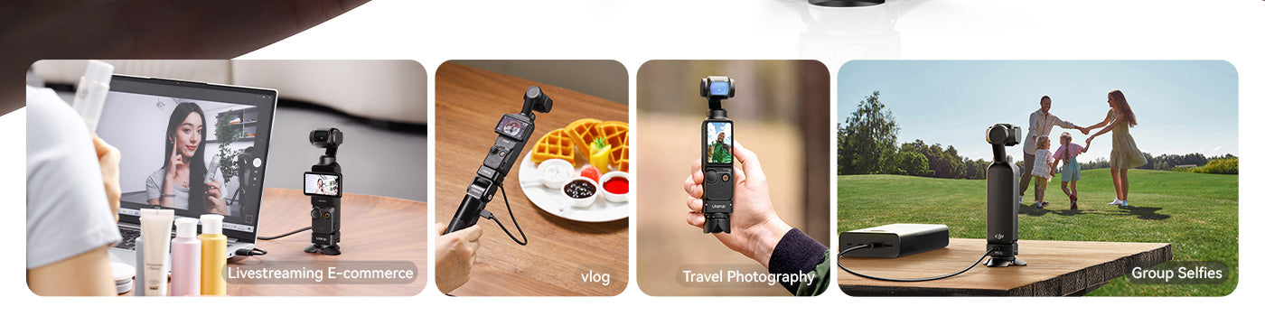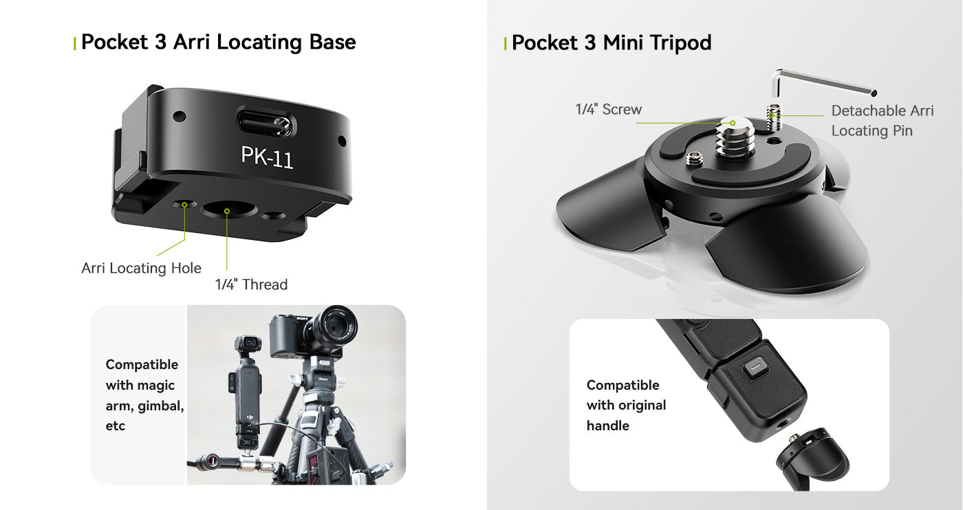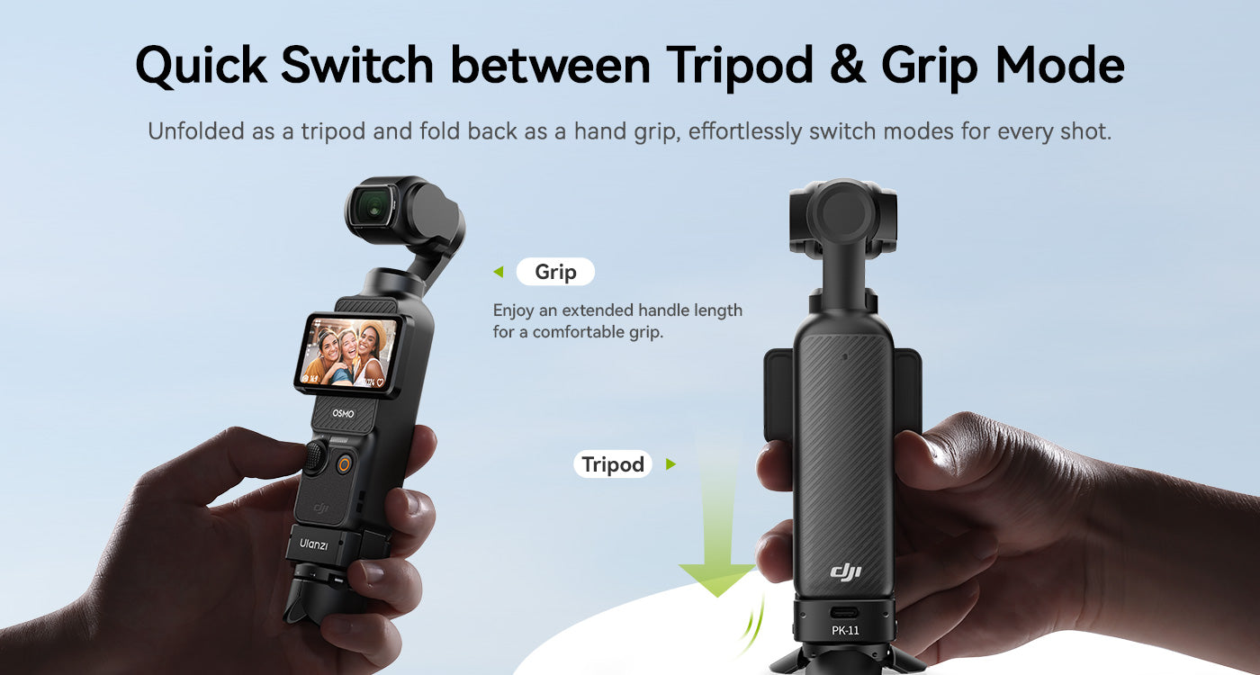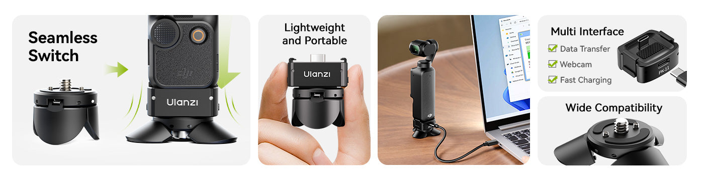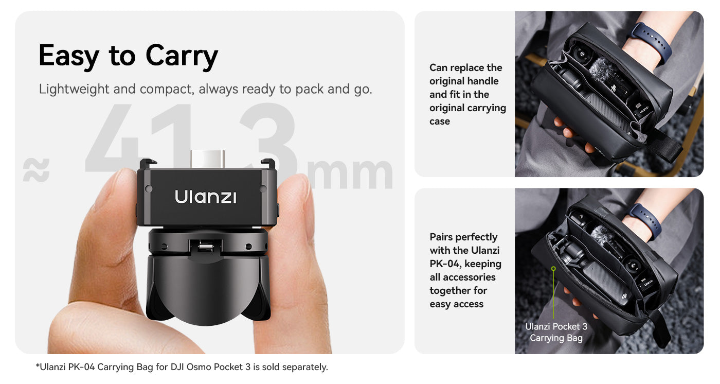 Mini stativ Ulanzi Pocket3 je idealen kompaktni spremljevalec za uporabnike DJI Osmo Pocket 3, ki iščejo stabilnost in prilagodljivost na poti. Z lahkotno zasnovo in večnamensko funkcionalnostjo se zlahka preklaplja med načinom stativa in ročnim držalom. Vgrajen 1/4-palčni vijak in snemljiv Arri-pritrdilni zatič zagotavljata široko združljivost z dodatki, medtem ko polno funkcionalni podatkovni vmesnik Type-C omogoča polnjenje med uporabo. Ta mini stativ je idealen za potovanja, vloganje in snemanje na mizi ter ponuja profesionalno zmogljivost v žepni velikosti