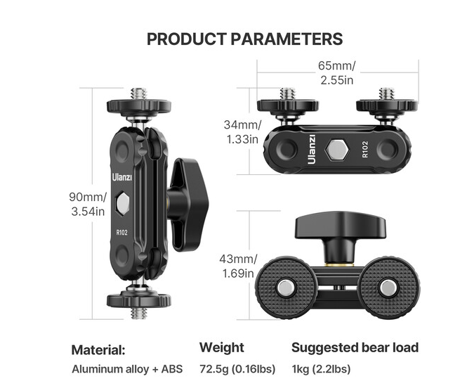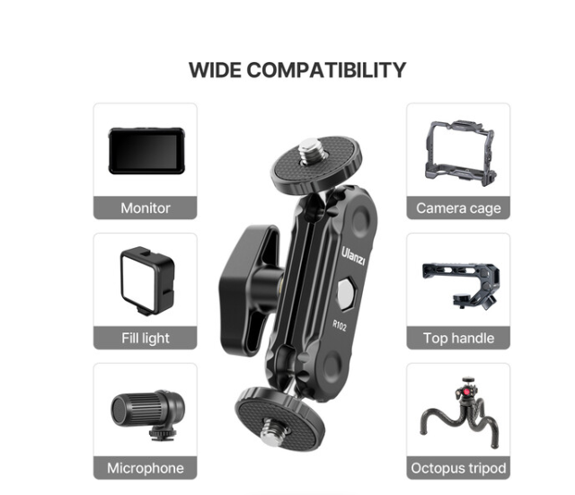 Ulanzi R102 Double Ball Head Magic Arm je kompakten in vsestranski pripomoček za montažo, namenjen ustvarjalcem, ki potrebujejo prilagodljivo namestitev zunanje opreme. Je idealen za pritrditev dodatkov, kot so terenski monitorji, LED-dopolnilne luči, mikrofoni ali druga oprema, na ohišja kamer, stative ali nosilne konstrukcije.