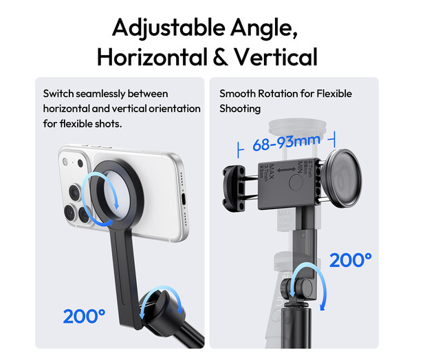 Opremljen z nastavljivo sponko za telefon (68–93 mm), SK26 varno drži široko paleto pametnih telefonov. Njegovo gladko vrtenje za 200° na podlagi in nosilcu omogoča enostavno preklapljanje med vodoravnim in navpičnim snemanjem, kar vam daje popoln nadzor nad kadriranjem za TikTok, YouTube ali fotografijo.