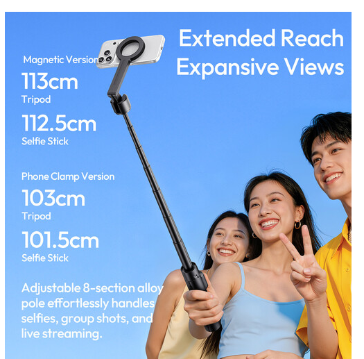 8-delna raztegljiva palica iz zlitine doseže do 101,5 cm kot palica za selfije in 103 cm kot stativ, kar omogoča širok pogled in prilagodljive kote snemanja. Kljub svojemu dosegu ostaja zasnova lahka in prenosna, kar omogoča enostavno prenašanje na potovanjih ali pri vsakdanji uporabi.