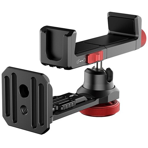 Nosilec podpira tako Arca-tip hitro sprostitev kot standardno 1/4"-20 navojno povezavo, kar omogoča enostavno pritrditev na stative, monopode, palice za selfije, ročaje in kamere. Vgrajena kroglica omogoča 360° vrtenje in gladko nastavitev naklona, kar vam daje popolno svobodo pri preklopu med pokončno in ležečo usmeritvijo ali nastavitvi natančnih kotov snemanja.