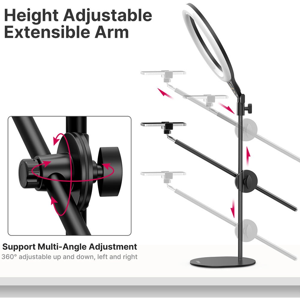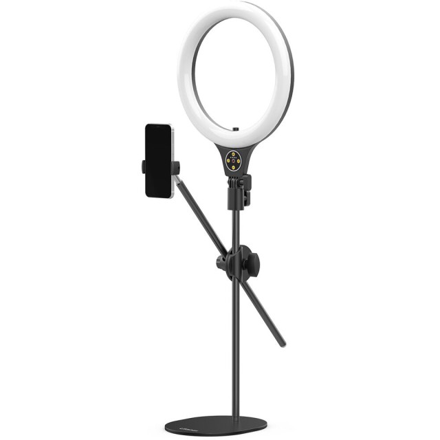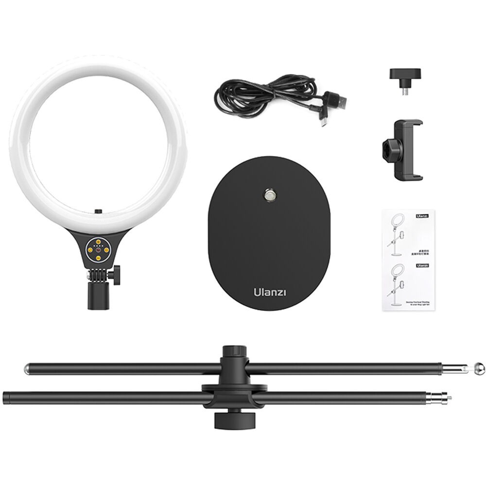 Komplet Ulanzi T1 Desktop Overhead Shooting Bracket Ring Light Set ustvarjalcem omogoča natančno in prilagodljivo osvetljevanje in snemanje motivov od zgoraj. 10-palčna LED-obročna luč ponuja nastavljivo barvno temperaturo od 3500 K (topla) do 6500 K (dnevna svetloba) in 11 stopenj svetlosti, kar zagotavlja optimalno osvetlitev za različne scenarije. Stojalo se razteza do 32 palcev in ima dve neodvisno nastavljivi nosilni palici za svetlobo in pametni telefon, ki se lahko nagibata in vrtita za 360° za natančno pozicioniranje.